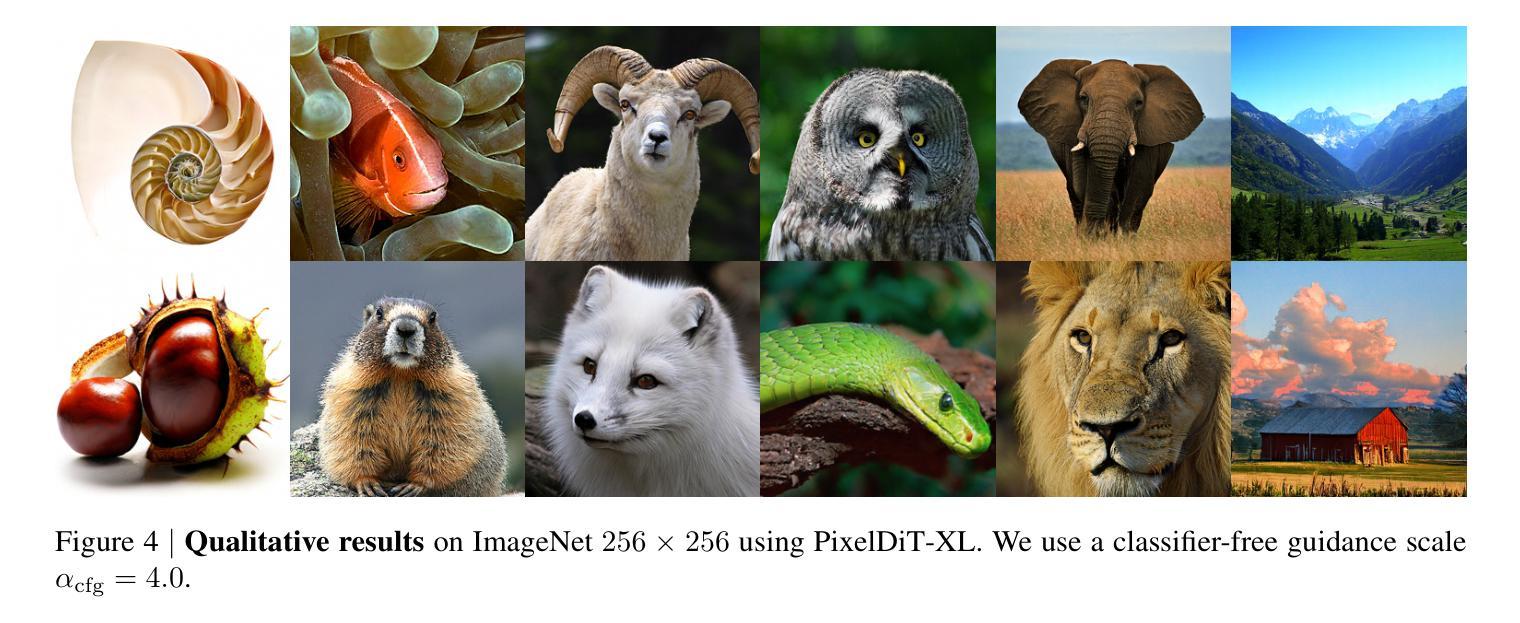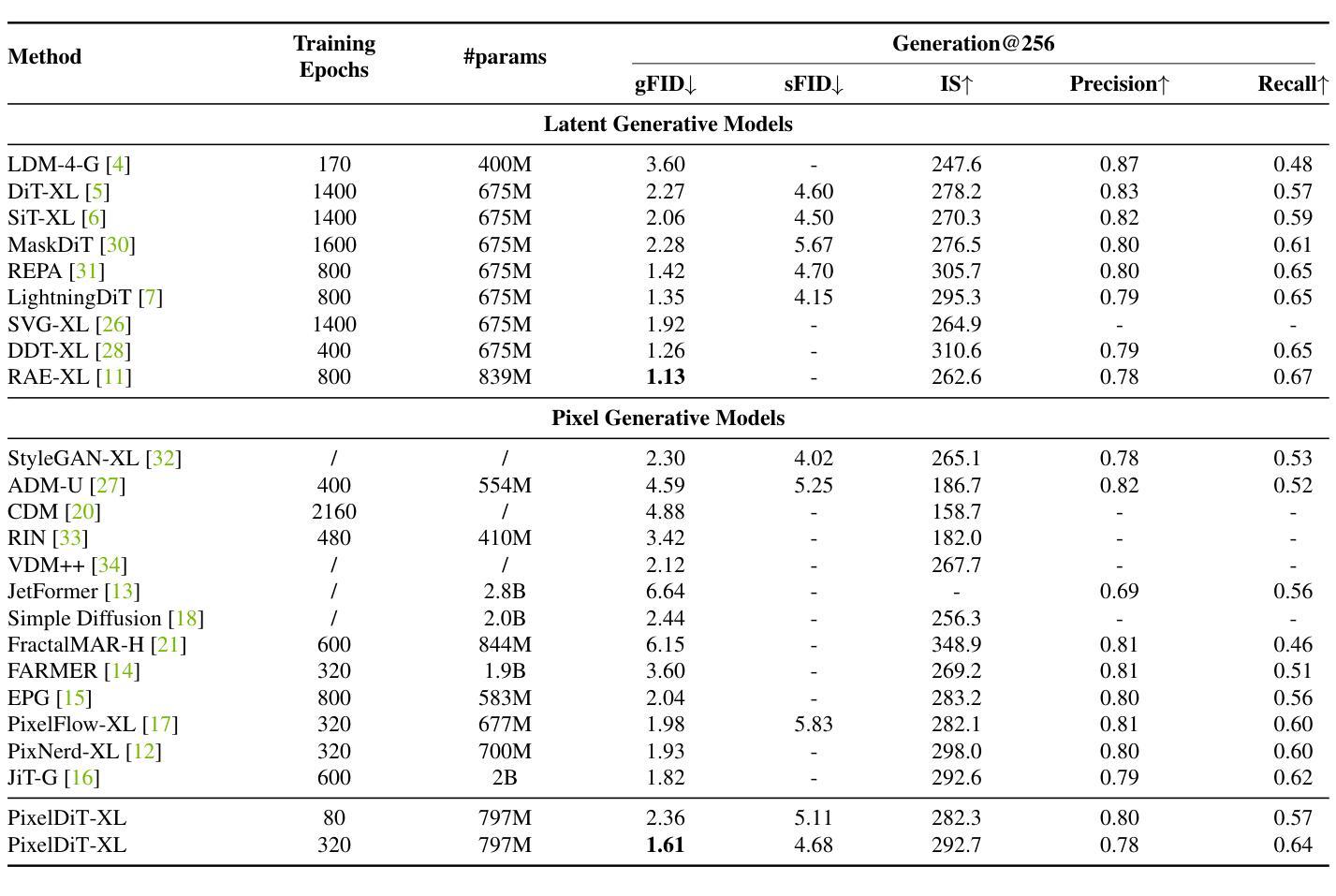 - PixelDiT在ImageNet 256x256上实现了高FID分数,显著优于现有像素生成模型。