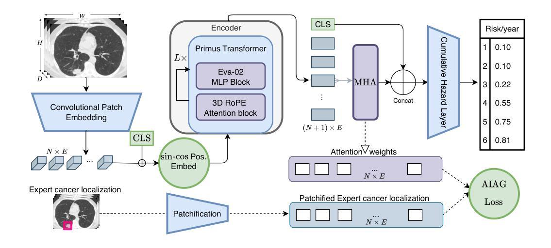 肺癌风险评估的重要性随着越来越多的国家引入使用低剂量计算机断层扫描(LDCT)的全民筛查项目而日益增加。随着图像数据的增长,能够处理整个肺部数据的高效可伸缩方法对于挖掘这些大规模筛查数据集的全部潜力至关重要。现有方法过于依赖像素级注释,限制了可扩展性,或以片段形式分析肺部,降低了性能。我们提出了 LungEvaty,这是一个基于完全变压器的框架,可从单个 LDCT 扫描中预测 1-6 年的肺癌风险。该模型在整肺输入上运行,直接从大规模筛查数据中学习,以捕获与恶性肿瘤风险相关的全面解剖和病理线索。仅使用图像数据且无需区域监督,LungEvaty 可达到最新性能水平,并通过可选的解剖学信息注意力引导(AIAG)损失进行细化,该损失鼓励关注解剖学重点。总而言之,LungEvaty 接受了超过 9 万次 CT 扫描的训练,其中包括超过 2.8 万次微调扫描和 6 千次评估扫描。该框架提供了一个简单、高效且完全开源的解决方案,为未来纵线和多模式肺癌风险预测研究提供了可扩展的基础。