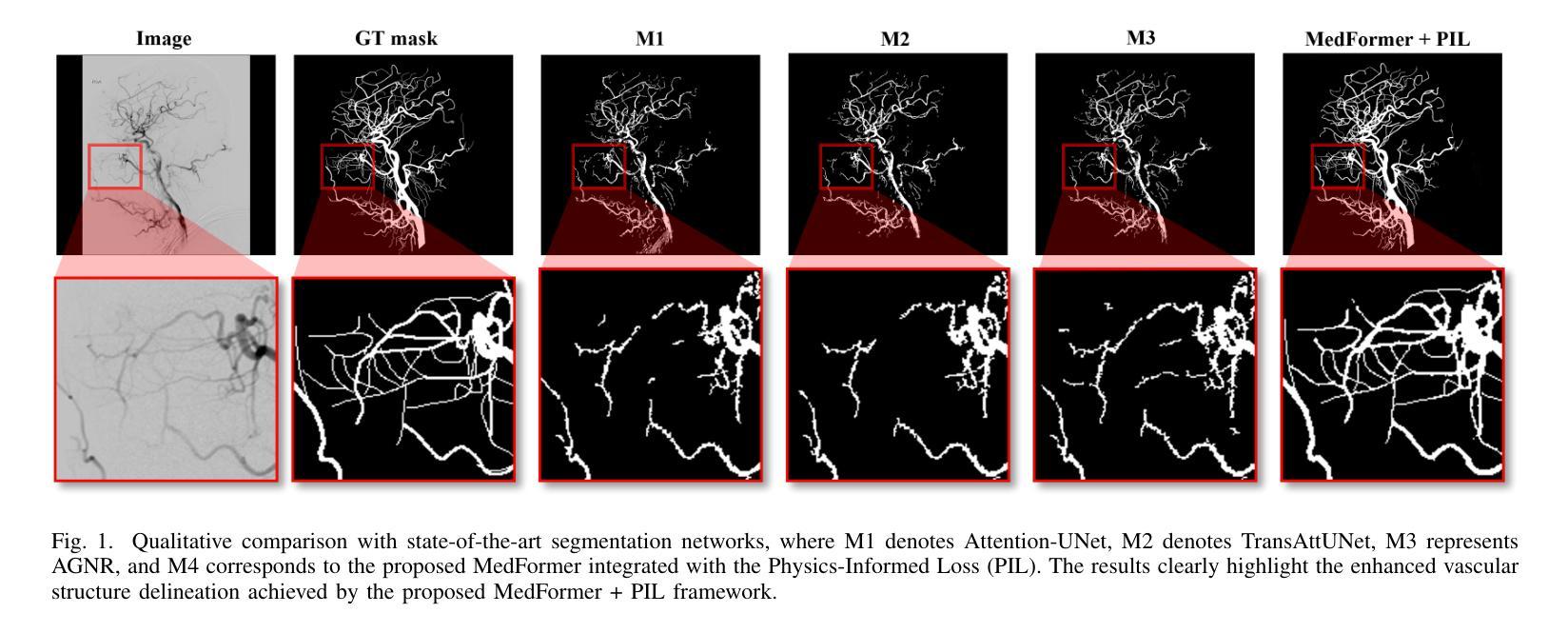 本文提出了一种新的物理信息损失(Physics-Informed Loss,PIL)方法,用于在数字减影血管造影(DSA)序列中准确提取和分割脑动脉。该方法通过模拟预测边界和真实边界之间的相互作用,以材料物理学中的位错理论为灵感,引入物理正则化项,提高了血管分割的精度和鲁棒性。实验结果表明,与传统的损失函数相比,PIL在动态血管造影成像中的血管分割性能更优。