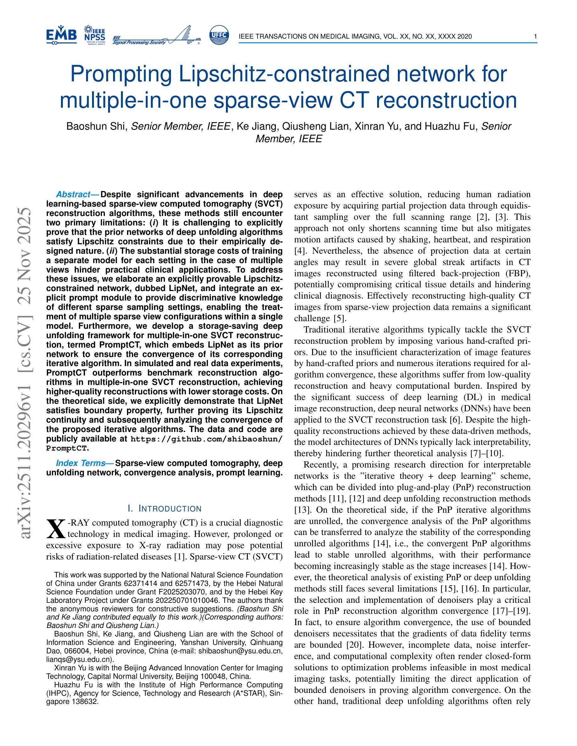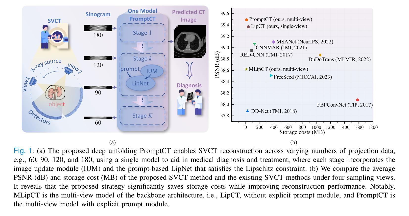 本文介绍了针对稀疏视角计算机断层扫描(SVCT)重建算法的两个主要挑战的解决方案。首先,提出了一种名为LipNet的显式可证明的Lipschitz约束网络,以解决难以证明深度展开算法先验网络满足Lipschitz约束的问题。其次,开发了一种名为PromptCT的存储节省型深度展开框架,用于处理多个稀疏视角配置的单模型重建问题,并结合了显式提示模块提供不同稀疏采样设置的区别知识。实验表明,PromptCT在多个方面的SVCT重建中优于基准重建算法,可实现高质量重建和较低的存储成本。同时公开了数据和代码以供使用。