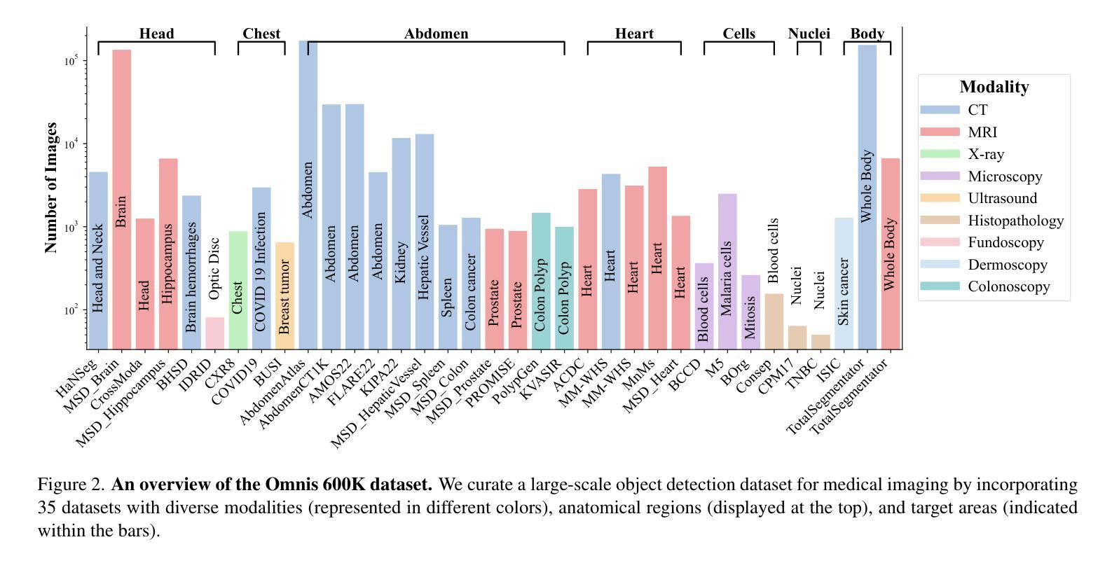 医学成像中传统目标检测模型采用封闭集模式,无法检测新型标签的对象。开放词汇目标检测(OVOD)解决了此局限性,但在医学成像中因数据集稀缺和文本图像对齐不佳而未被充分探索。为弥补这一空白,我们推出MedROV,首个医学成像实时开放词汇检测模型。通过构建大型Omnis数据集和采用伪标签策略处理多源数据集的缺失注释,实现开放词汇学习。结合预训练大型基础模型的知识,提高通用性。利用对比学习和跨模态表示,MedROV可有效检测已知和新型结构。实验结果证明,MedROV在医学图像检测方面超越最新基础模型,平均绝对提升40 mAP50,较封闭集检测器提升超过3 mAP50,且以每秒70帧运行,为医学检测设定新基准。