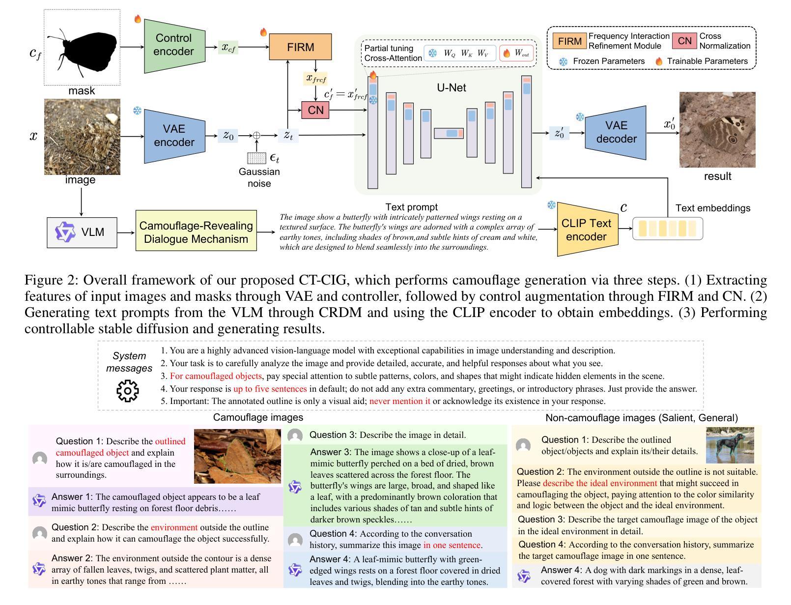 - 提出可控文本指导的伪装图像生成方法 CT-CIG,利用大型视觉语言模型(VLM)和伪装揭示对话机制(CRDM)提升伪装图像质量。