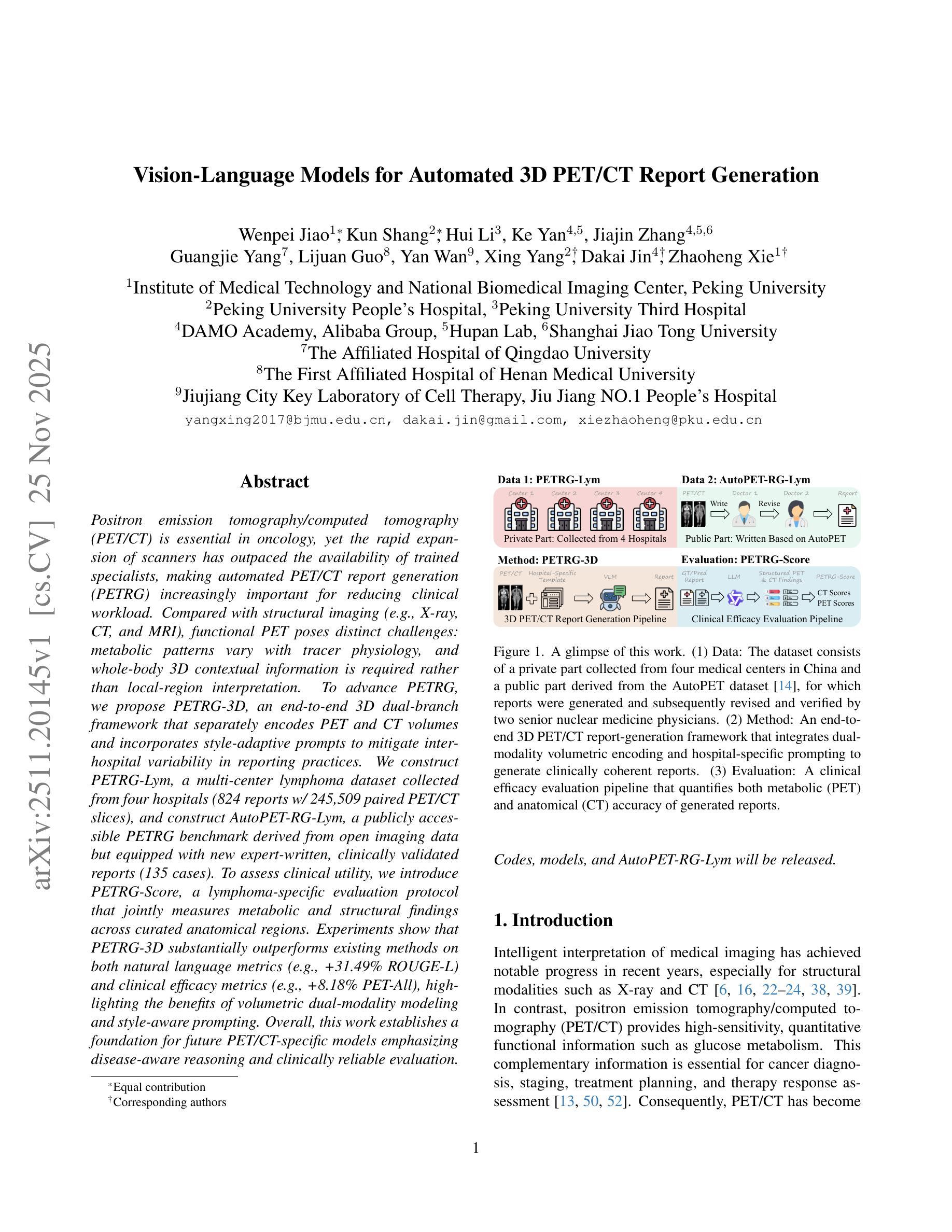 本文介绍了一种基于深度学习技术的自动化PET/CT报告生成系统PETRG-3D。通过构建多中心淋巴瘤数据集PETRG-Lym和公开基准测试AutoPET-RG-Lym,该系统实现了PET和CT影像的端到端三维双重分支框架编码,通过风格自适应提示来减轻不同医院报告实践的差异。实验结果显示,PETRG-3D在自然语言指标和临床有效性指标上均显著优于现有方法,证明了其临床实用价值。这为未来的PET/CT特定模型提供了基础,强调疾病感知推理和临床可靠评估的重要性。