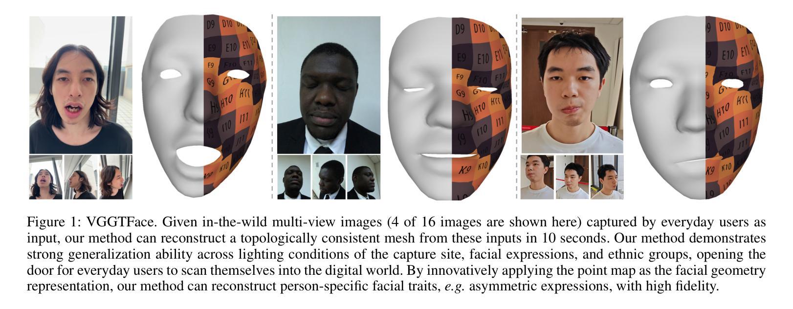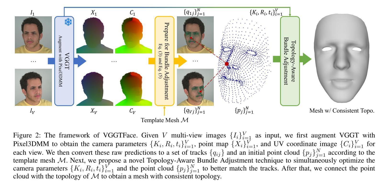 该文提出一种基于VGGT(三维基础模型)和Pixel3DMM(三维可变形模型)的面部几何重建方法。通过融合两种方法,实现从日常用户采集的多视角照片自动重建面部几何模型,具有强大的泛化能力和表现力。为解决VGGT缺乏拓扑信息的问题,引入Pixel3DMM注入拓扑信息,并采用拓扑感知捆绑调整策略融合点云数据,实现高质量快速重建。