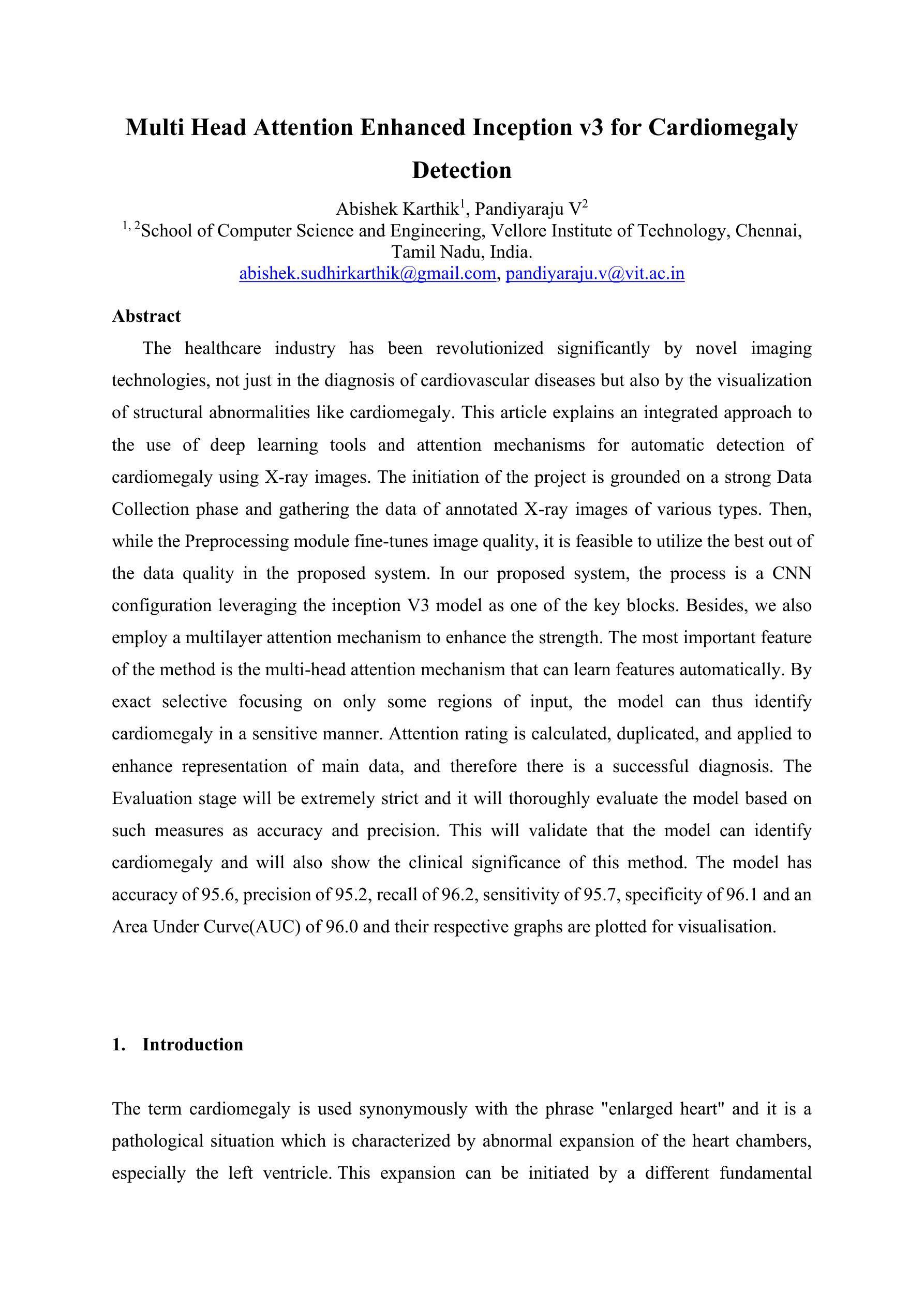 医疗健康行业被新型成像技术彻底革新,这不仅体现在心血管疾病的诊断上,还体现在诸如心脏增大等结构异常的可视化上。本文介绍了一种利用深度学习工具和注意力机制自动检测心脏增大的X射线图像的综合方法。该项目的启动基于强大的数据采集阶段和收集各种已标注的X射线图像数据。然后,预处理模块对图像质量进行微调,以便在拟议系统中充分利用数据质量。在我们提出的系统中,过程是一个利用inception V3模型作为关键模块之一的CNN配置。此外,我们还采用多层注意力机制来提升强度。该方法最重要的特点是多头注意力机制,它可以自动学习特征。通过精确选择仅聚焦在某些输入区域上,该模型能够以敏感的方式识别心脏增大。计算注意力评分,对其进行复制并应用于增强主数据的表示,从而进行成功的诊断。评估阶段将非常严格,它将根据准确性、精确度等指标对模型进行全面评估。这将验证模型识别心脏增大的能力,并显示该方法的临床意义。该模型的准确度为95.6%,精确度为95.2%,召回率为96.2%,灵敏度为95.7%,特异度为96.1%,曲线下面积(AUC)为92.0,并绘制了相应的图表用于可视化展示。