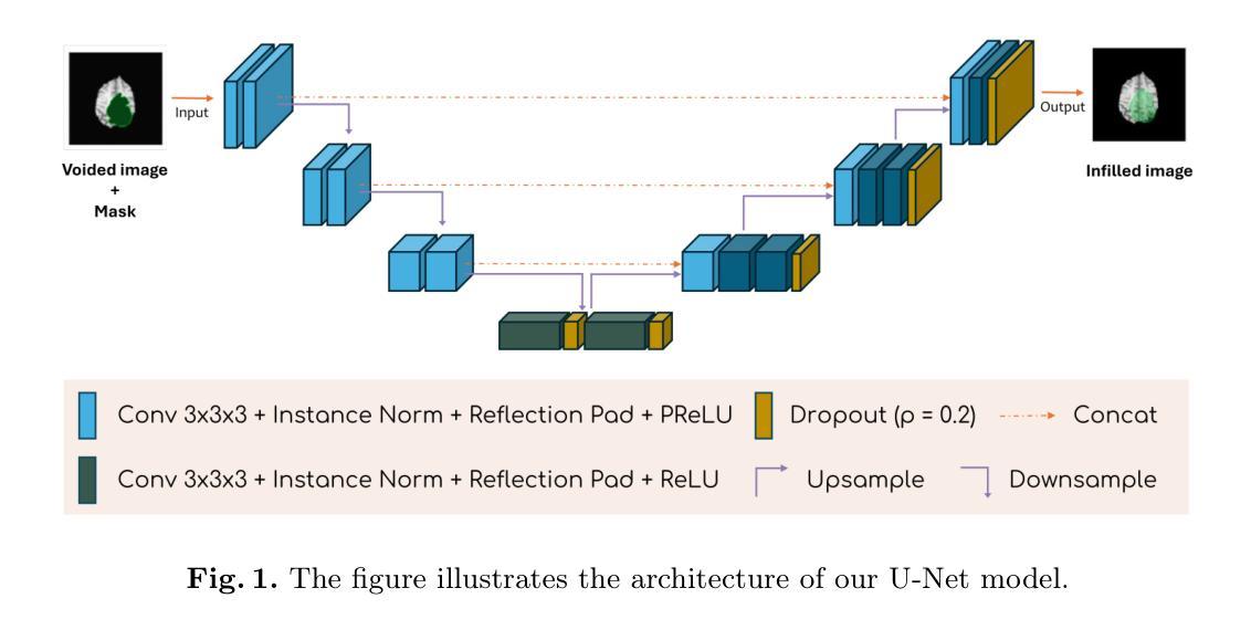 - 该方法的核心是训练的U-Net架构,用于填充合成破坏区域。