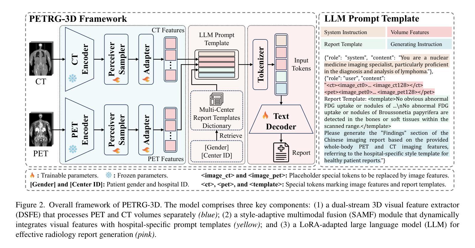 - PETRG-3D是一种先进的自动化报告生成技术,结合了PET和CT体积的单独编码以及风格自适应提示技术,应对不同医院间的报告实践差异。