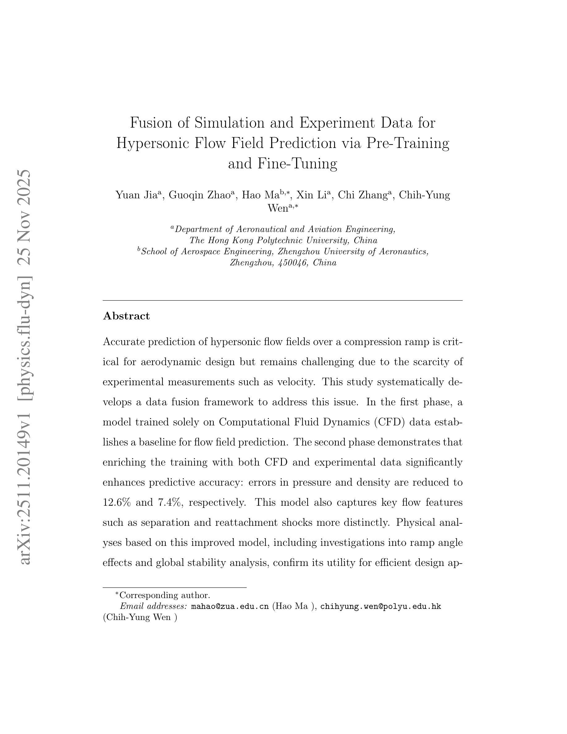 准确预测压缩坡面上的高超音速流场对空气动力学设计至关重要,但由于速度等实验测量的稀缺性,这仍然是一个挑战。本研究系统地开发了一个数据融合框架来解决这个问题。在第一阶段,仅使用计算流体动力学(CFD)数据训练的模型为流场预测建立了基准。第二阶段表明,用CFD和实验数据丰富训练会显著提高预测精度:压力和密度的误差分别降至12.6%和7.4%。该模型还能更清晰地捕捉流场的关键特征,如分离和再附冲击等。基于这一改进模型的物理分析,包括对斜坡角度影响和全局稳定性分析的调查,证实了其在高效设计应用中的实用性。在第三阶段,使用仅CFD数据的预训练模型成功地使用实验纹影图像进行了微调,有效地重建了速度场并验证了该方法的可转移性。这种分步的方法论展示了通过预训练和微调结合模拟和实验的有效性,为现实世界中的高超音速流建模提供了稳健高效的途径。
