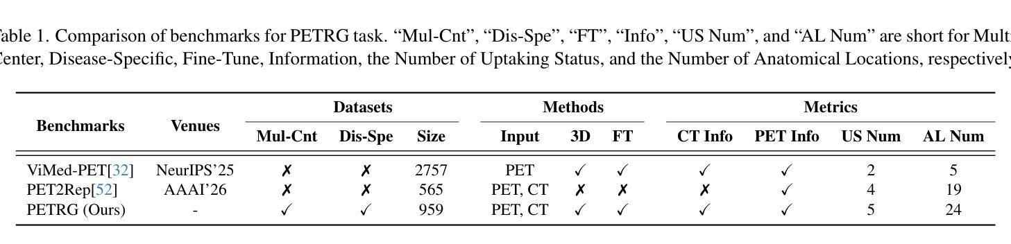 - PET/CT在肿瘤学中至关重要,但专业人员的缺乏促使了自动化PET/CT报告生成的必要性和紧迫性。