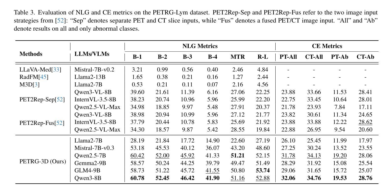 - 实验结果展示了PETRG-3D在临床指标和自然语言处理指标上的显著优势,证明了其在自动化报告生成领域的先进性。