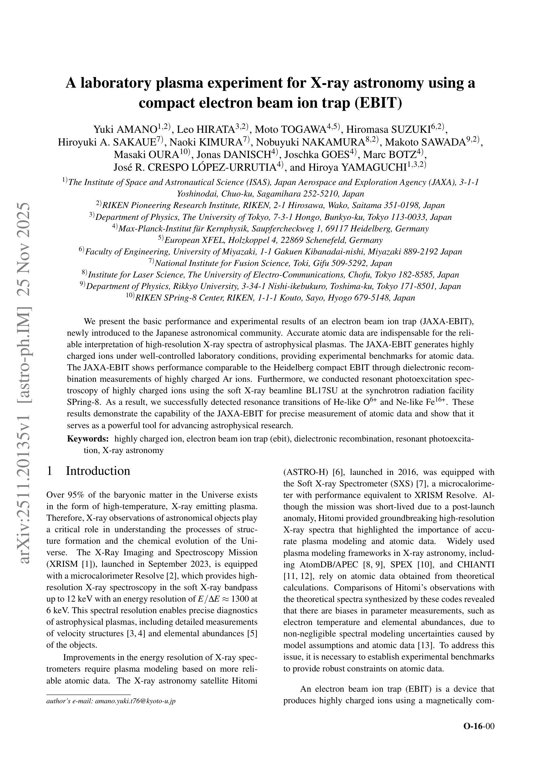 日本天文界引入了电子束离子阱(JAXA-EBIT),用于产生高度带电离子,为原子数据提供实验基准。其与海德堡紧凑EBIT的性能相当,并通过共振光电离光谱法成功检测到He类O^6+和Ne类Fe^16+的共振跃迁。这为精确测量原子数据和推进天文研究提供了有力工具。