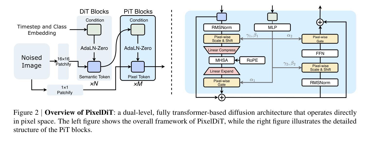 - PixelDiT采用两级设计,包括补丁级DiT捕捉全局语义,像素级DiT细化纹理细节。
