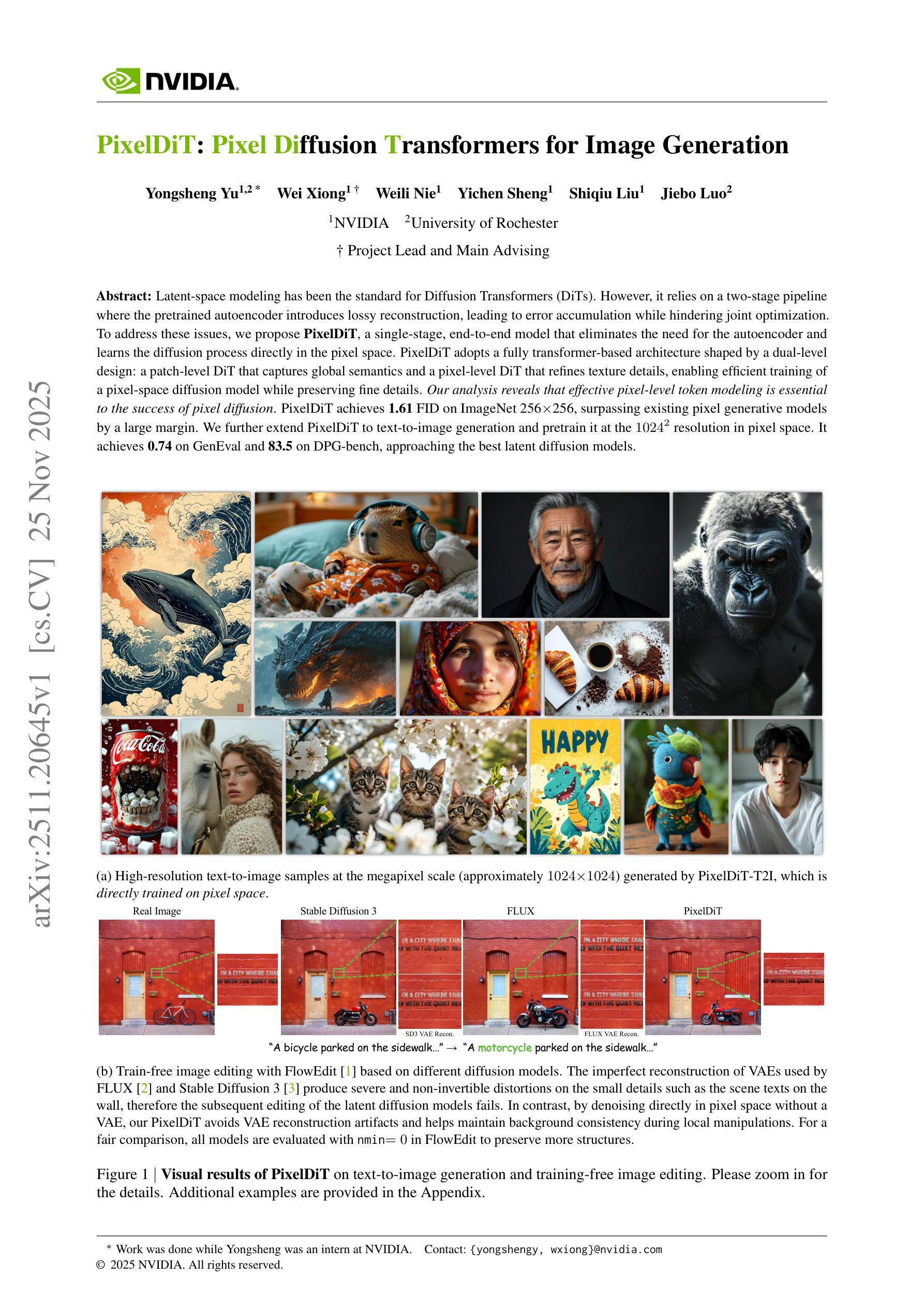 隐式空间建模一直是扩散变压器(DiTs)的标准。然而,它依赖于一个两阶段的管道流程,其中预训练的自动编码器会导致有损重建,从而导致误差累积并阻碍联合优化。为了解决这些问题,我们提出了PixelDiT,这是一个单阶段端到端的模型,它不需要自动编码器,直接在像素空间学习扩散过程。PixelDiT采用基于完全变压器的架构,由两级设计构成:一个用于捕获全局语义的补丁级DiT和一个用于细化纹理细节的像素级DiT,这能够在保持细节的同时,有效地训练像素空间扩散模型。我们的分析表明,有效的像素级令牌建模是像素扩散成功的关键。PixelDiT在ImageNet 256x256上实现了1.61的FID,大大超越了现有的像素生成模型。我们将PixelDiT进一步扩展到文本到图像生成,并在像素空间以1024x1024的分辨率进行预训练。它在GenEval上达到了0.74,在DPG-bench上达到了83.5,接近最佳的隐式扩散模型。