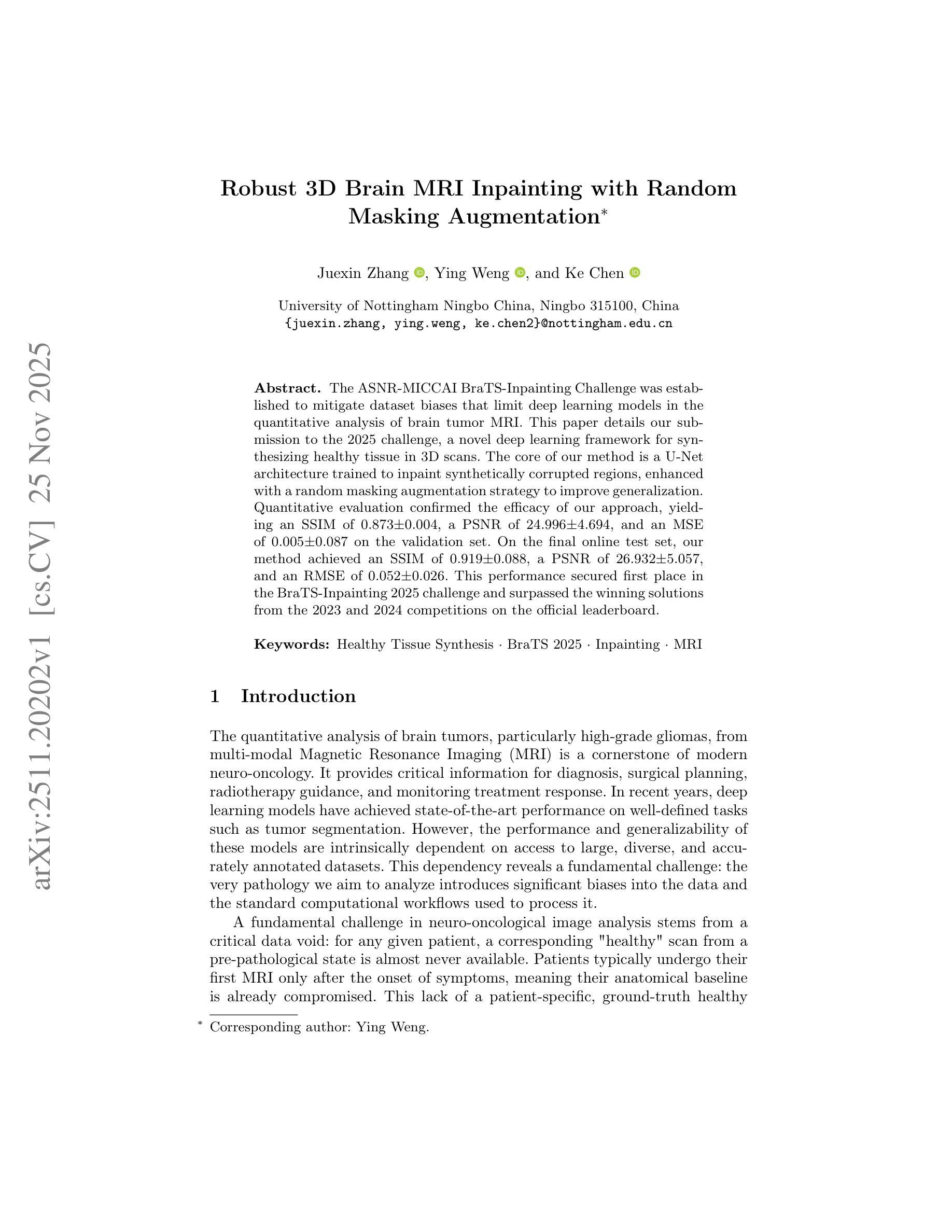 本论文提交了一项针对ASNR-MICCAI BraTS-Inpainting挑战的新型深度学习框架,旨在合成健康组织在三维扫描中的修复技术。通过训练U-Net架构来填充合成破坏区域,并使用随机掩膜增强策略提高泛化能力。定量评估证实此方法有效,在验证集和最终测试集上均取得优异成绩,获得BraTS-Inpainting 2025挑战第一名。