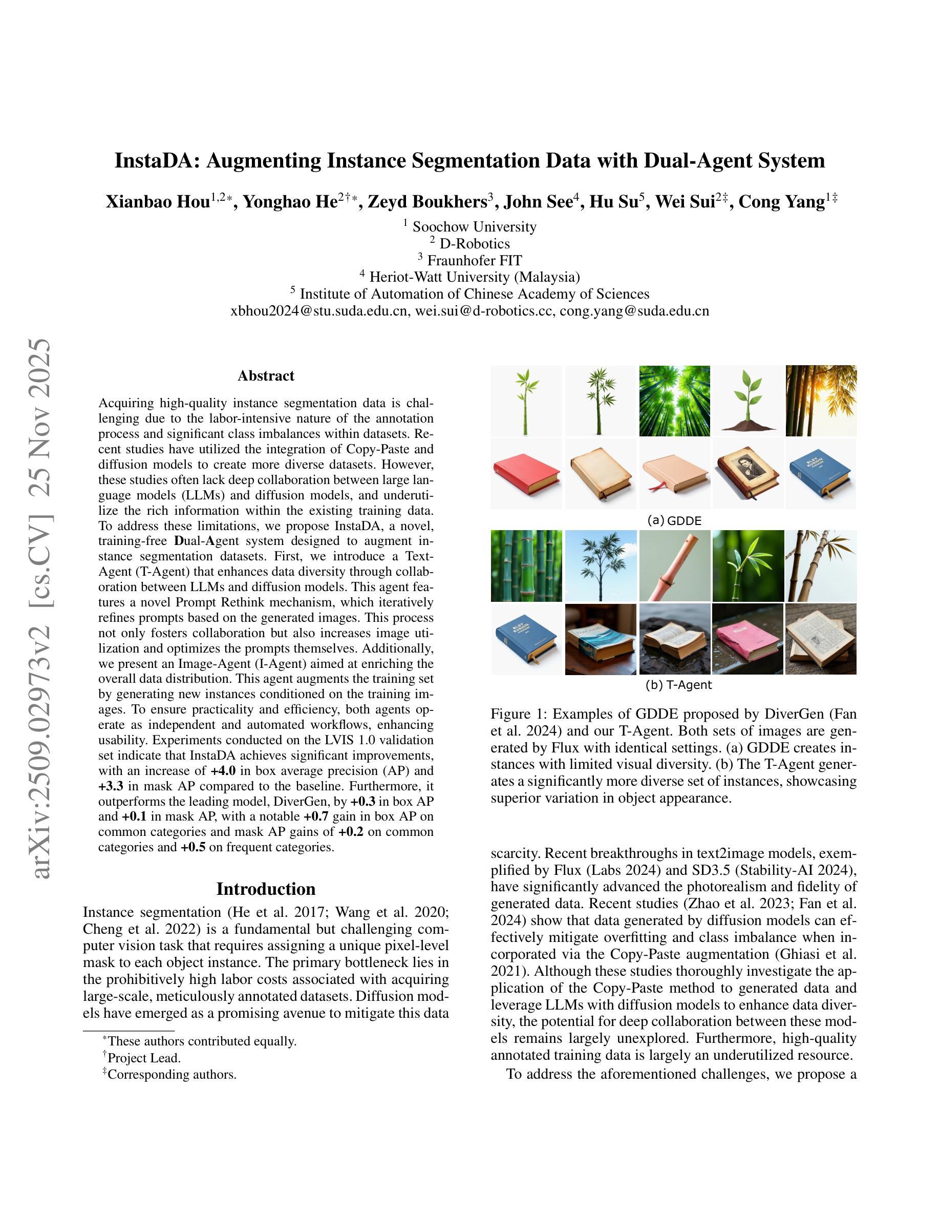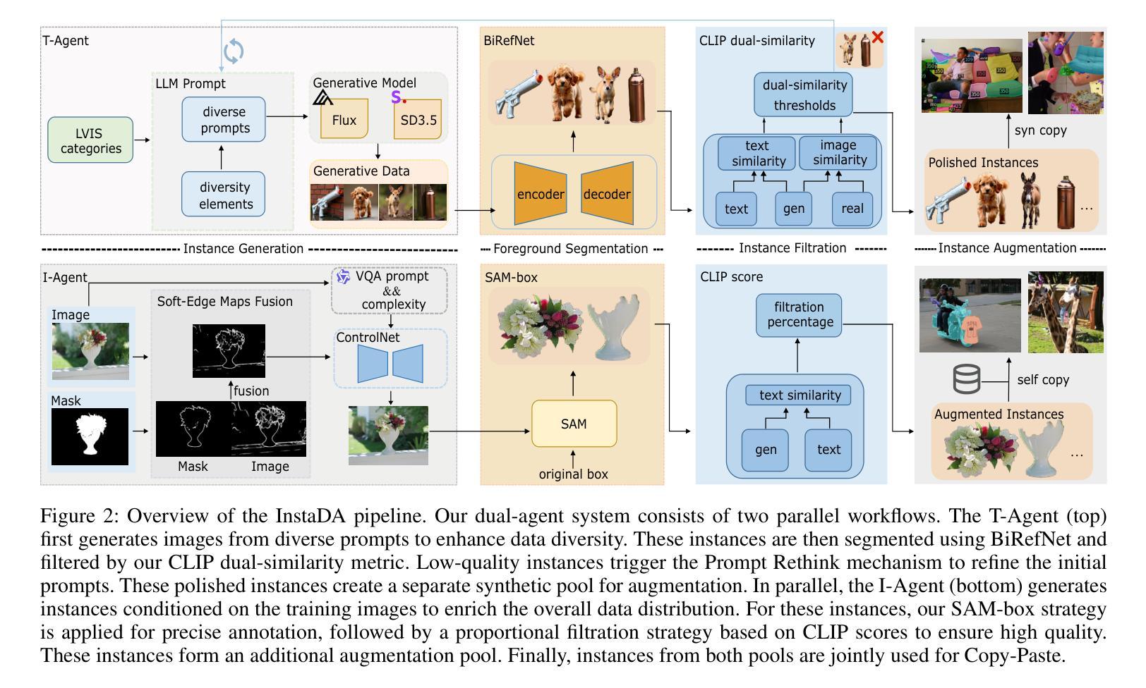 获取高质量的实例分割数据是一个挑战,因为标注过程劳动密集,并且数据集内的类别不平衡问题显著。最近的研究通过结合Copy-Paste和扩散模型来创建更多样化的数据集。然而,这些研究往往缺乏大型语言模型(LLM)和扩散模型之间的深入合作,并且未能充分利用现有训练数据中的丰富信息。为了解决这些局限性,我们提出了InstaDA,这是一种无需训练的新型双代理系统,旨在增强实例分割数据集。首先,我们引入文本代理(T-Agent),它通过LLM和扩散模型的协作提高数据多样性。该代理具有新颖提示反思机制,根据生成的图像迭代优化提示。这个过程不仅促进了协作,还提高了图像利用率并优化了提示本身。此外,我们还推出了图像代理(I-Agent),旨在丰富整体数据分布。该代理通过基于训练图像生成新实例来丰富训练集。为确保实用性和效率,两个代理作为独立自动化工作流程运行,增强了可用性。在LVIS 1.0验证集上进行的实验表明,InstaDA取得了显著的改进,框平均精度(AP)提高了+4.0,掩膜AP提高了+3.3,超过了基线。此外,它超越了领先模型DiverGen,在框AP上高出+0.3,掩膜AP上高出+0.1,在常见类别上框AP增益显著为+0.7,掩膜AP在常见类别上增益为+0.2,频繁类别上增益为+0.5。