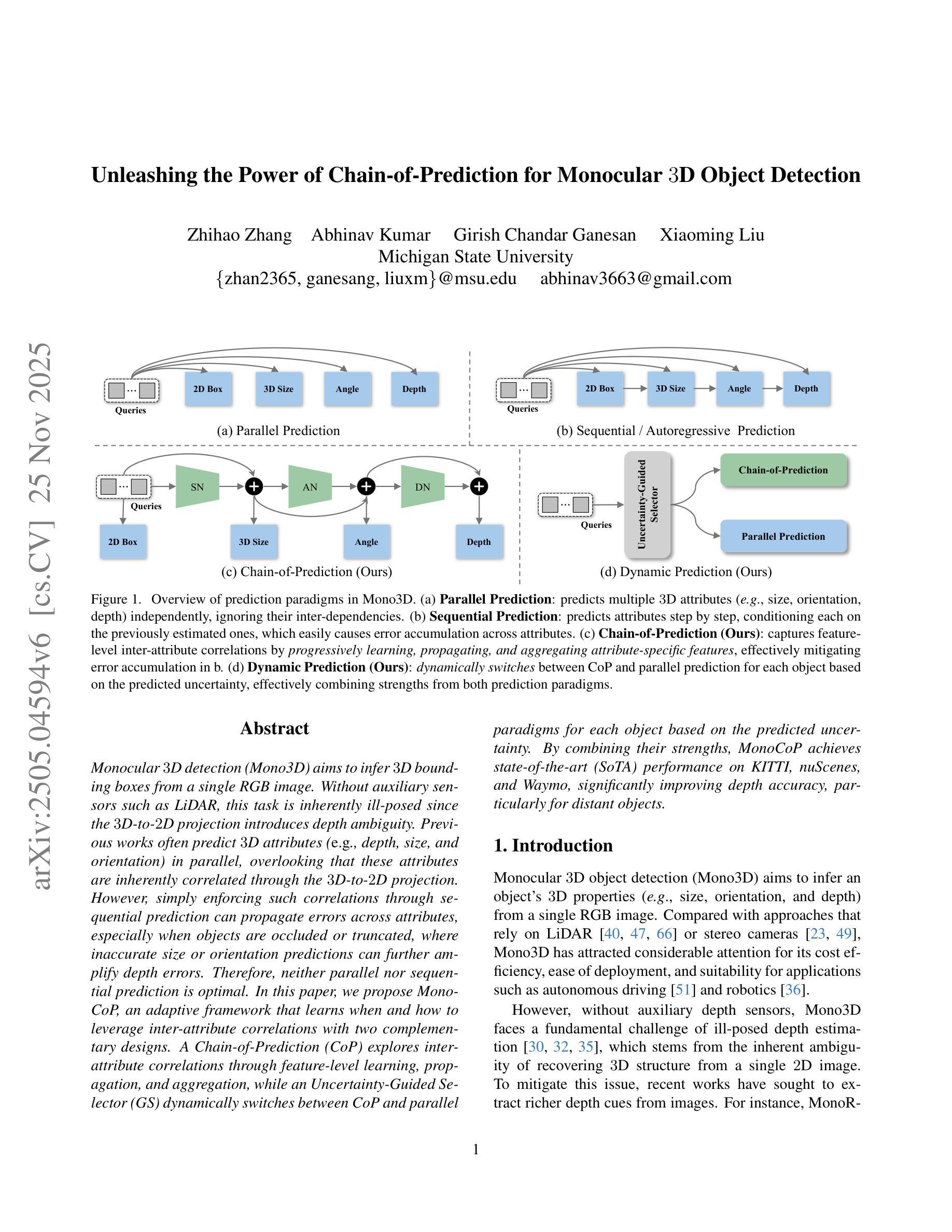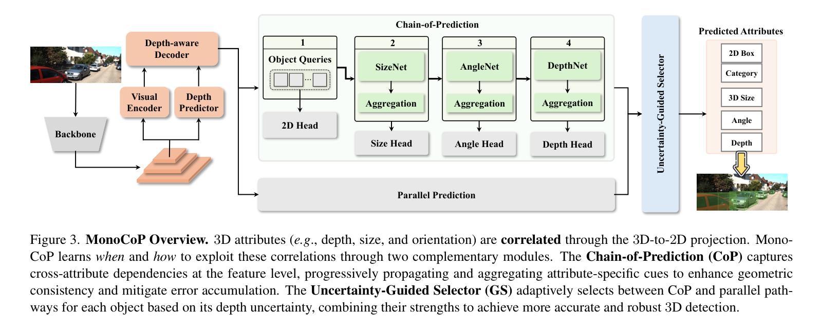 单目3D检测(Mono3D)旨在从单一RGB图像中推断出3D边界框。由于没有激光雷达等辅助传感器,此任务本质上是不适定的,因为3D到2D的投影引入了深度歧义。先前的工作经常并行预测3D属性(例如深度、大小和方向),忽视了这些属性通过3D到2D的投影本质上是相关的。然而,仅仅通过顺序预测来强制执行这种关联可能会在属性之间传播错误,特别是当物体被遮挡或截断时,不准确的大小或方向预测可能会进一步放大深度错误。因此,并行预测和顺序预测都不是最优的。在本文中,我们提出了MonoCoP,一个自适应的框架,它学习何时以及如何利用属性间的关联,具有两个互补的设计。预测链(CoP)通过特征级学习、传播和聚合探索属性间的关联,而不确定性引导选择器(GS)则根据预测的的不确定性动态地在CoP和并行范式之间为每个对象切换。通过结合两者的优势,MonoCoP在KITTI、nuScenes和Waymo上实现了卓越的性能,特别是在深度准确性方面表现优异。