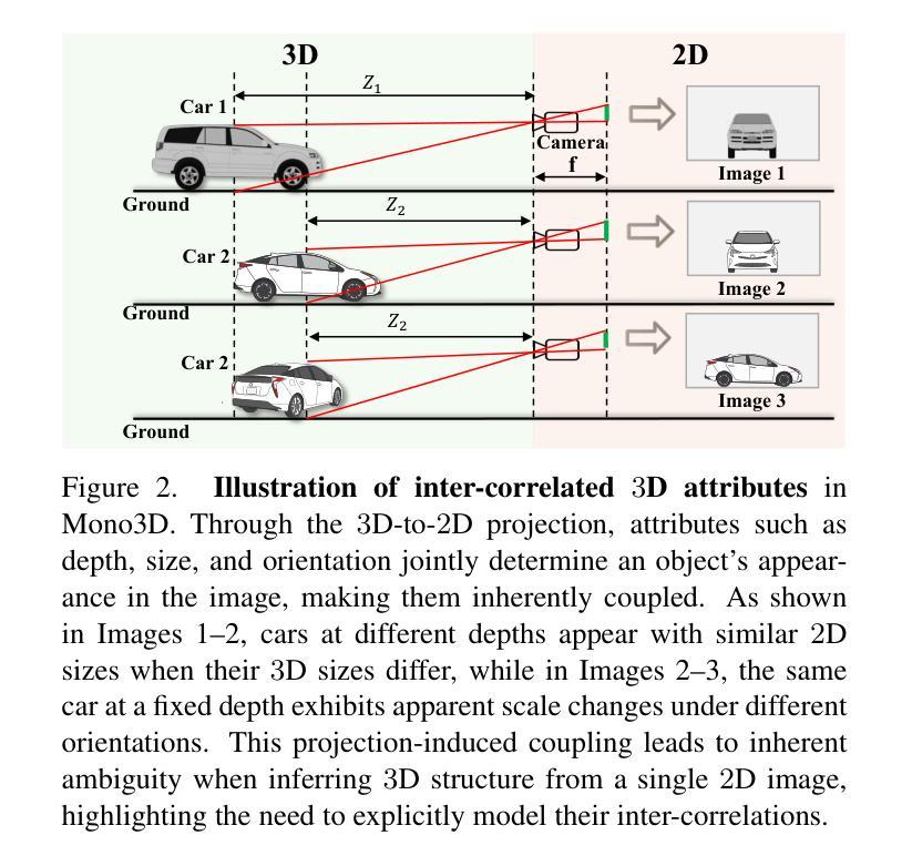 单目3D检测(Mono3D)的目标是从单个RGB图像中推断出3D边界框。由于没有激光雷达等辅助传感器,此任务本质上是不适定的,因为从3D到2D的投影引入了深度歧义。之前的工作通常并行预测3D属性(例如深度、大小和方位),忽略了这些属性通过从3D到2