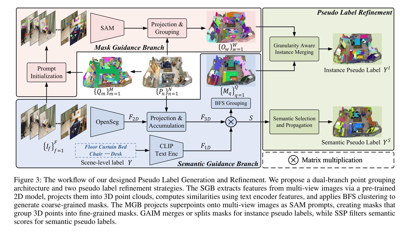 - 第一阶段利用双分支点分组模块生成伪标签,基于多视角图像的语义和掩膜线索。