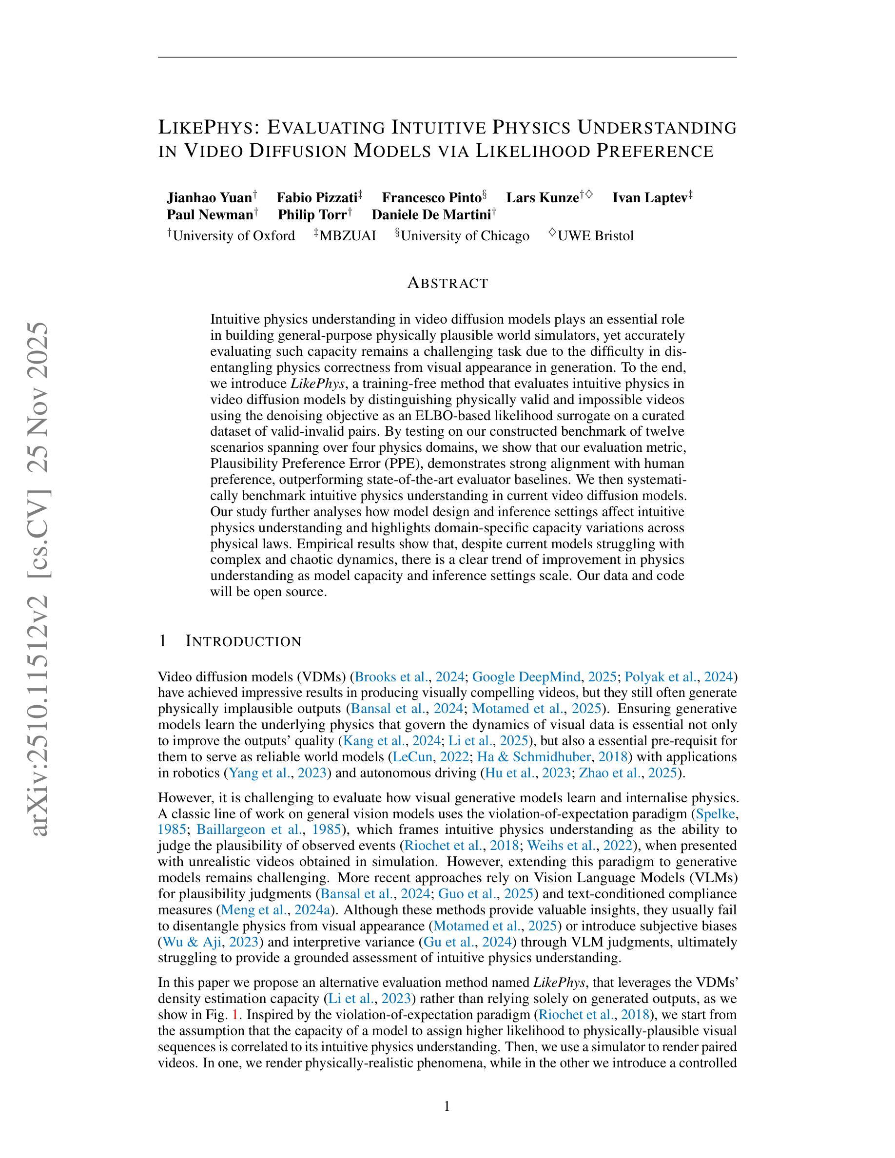 视频扩散模型中直觉物理理解在构建通用物理模拟世界中起着关键作用,但准确评估这种能力仍是一项挑战,因为生成中的物理正确性很难与视觉效果区分开来。为此,我们引入了LikePhys这一无需训练的方法,通过区分物理上有效和不可能的视频来评估视频扩散模型中的直觉物理。我们使用降噪目标作为基于ELBO的似然性替代来在有效与无效的视频对集上进行评估。通过在涵盖四个物理领域的十二种场景构建的基准测试,我们证明了我们的评估指标——可理解性偏好误差(PPE)与人类偏好高度一致,优于现有的评估基线。然后我们对当前视频扩散模型中的直觉物理理解进行了系统评估。我们的研究进一步分析了模型设计和推理设置如何影响直觉物理理解,并强调了不同物理定律下的领域特定能力差异。实验结果表明,尽管当前模型在复杂和混沌动力学方面表现困难,但随着模型容量和推理设置的扩大,对物理知识的理解存在明显的改善趋势。