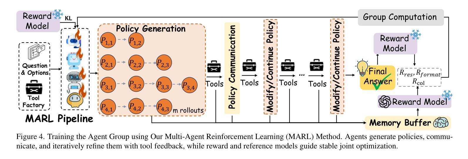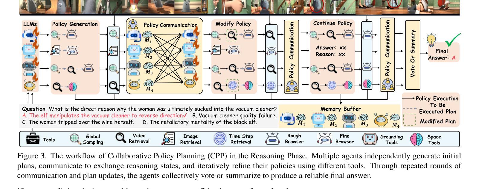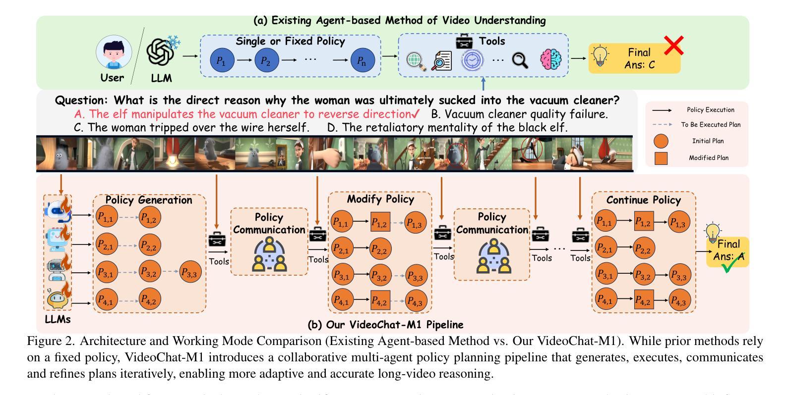 通过利用工具增强的多模态大型语言模型(MLLMs),多智能体框架正在推动视频理解领域的进步。然而,其中大多数采用静态且不可学习的工具调用机制,这限制了发现对于时间或空间复杂视频进行稳健感知和推理所必需的多种线索。为了解决这一挑战,我们提出了一种用于视频理解的新型多智能体系统,即VideoChat-M1。VideoChat-M1并不采用单一或固定的策略,而是采用独特的协作政策规划(CPP)范式,拥有多个政策智能体,这包括三个关键过程。(1)政策生成:每个智能体根据其用户的查询生成其独特的工具调用政策;(2)政策执行:每个智能体按顺序调用相关工具来执行其政策并探索视频内容;(3)政策通信:在政策执行的中间阶段,智能体彼此之间进行交互以更新其各自的政策。通过这一协作框架,所有智能体协同工作,根据来自同龄人的上下文线索动态调整其首选政策,以有效响应用户的查询。此外,我们的CPP范式配备了简洁的多智能体强化学习(MARL)方法。因此,政策智能体团队可以共同优化,以提高VideoChat-M1的性能,既受最终答案奖励的指导,也受中间协作过程反馈的影响。大量实验表明,VideoChat-M1在四个任务跨八个基准测试中实现了卓越的性能。值得注意的是,在LongVideoBench上,我们的方法优于SOTA模型Gemini 2.5 pro 3.6%,优于GPT-4o 15.6%。