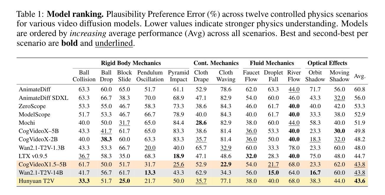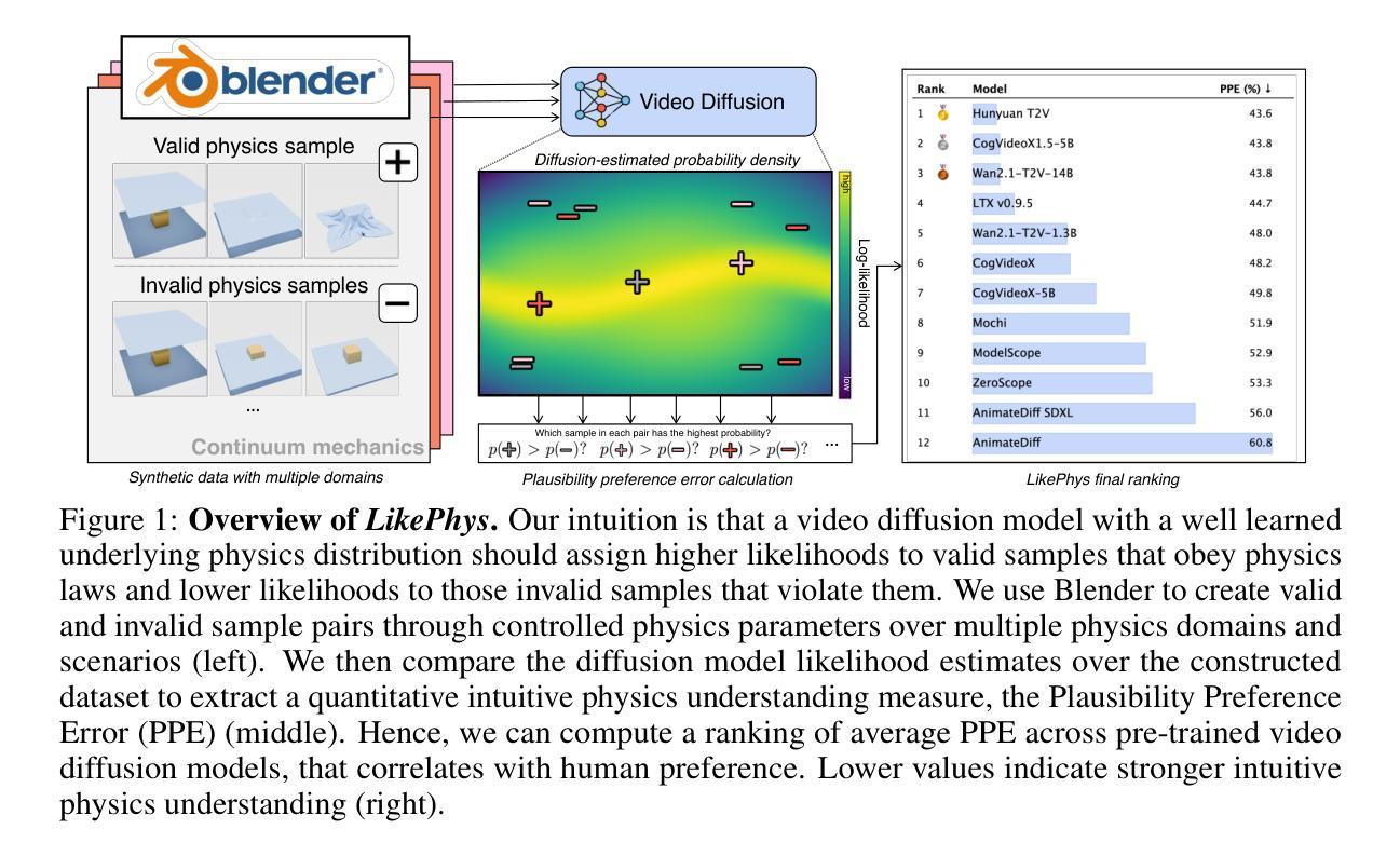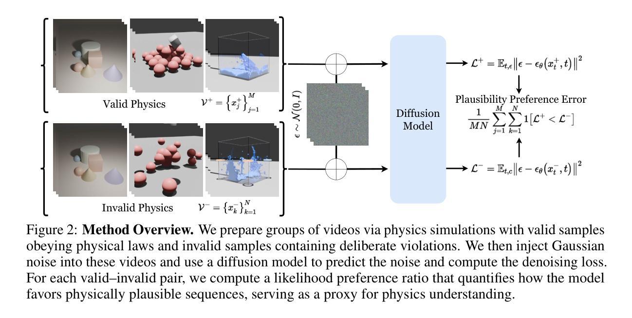 在视频扩散模型中,直观物理学理解在构建通用性物理可信的世界模拟器方面扮演着至关重要的角色。然而,准确评估这种能力仍然是一项具有挑战性的任务,因为很难将物理正确性从视觉外观中分离出来。为此,我们引入了LikePhys,这是一种无需训练的方法,通过区分物理上有效和不可能的视频来评估视频扩散模型中的直观物理学。我们使用去噪目标作为基于ELBO(证据下限)的似然性替代物,在一个有效的有效-无效对精选数据集上进行评估。通过在我们构建的涵盖四个物理领域的十二个场景基准测试上进行测试,我们展示了我们的评估指标——可信度偏好误差(PPE)与人类偏好高度一致,优于最新的评估基准。然后,我们对当前的视频扩散模型中的直观物理学理解进行了系统评估。我们的研究进一步分析了模型设计和推理设置如何影响直观物理学理解,并突出了不同物理定律领域的特定能力差异。实证结果表明,尽管当前模型在处理复杂和混沌动力学方面存在困难,但随着模型能力和推理设置的扩展,物理理解呈现出明显的改进趋势。