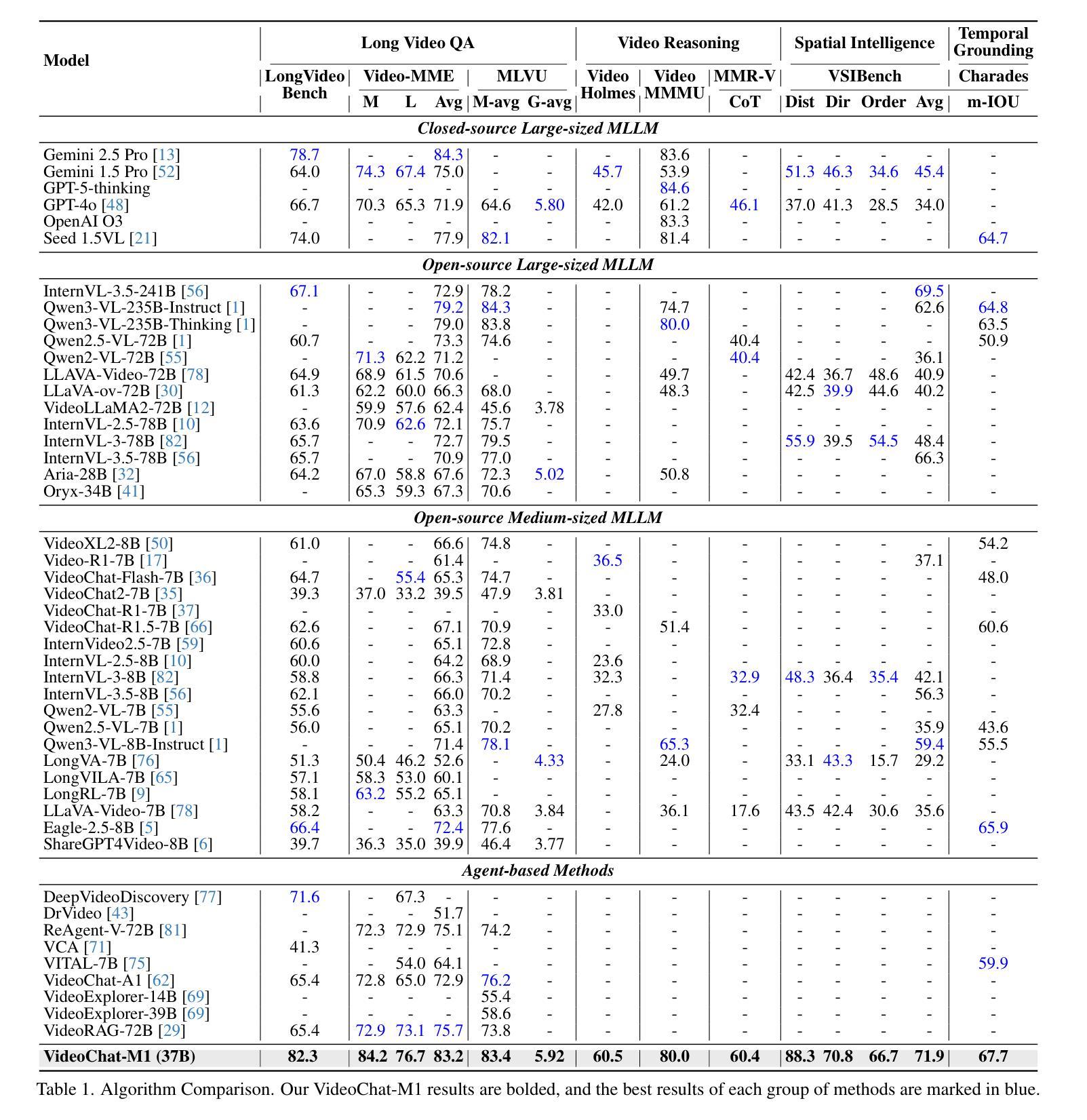 - VideoChat-M1在多个基准测试中实现了卓越性能,特别是相较于现有技术领先模型有显著的提升。