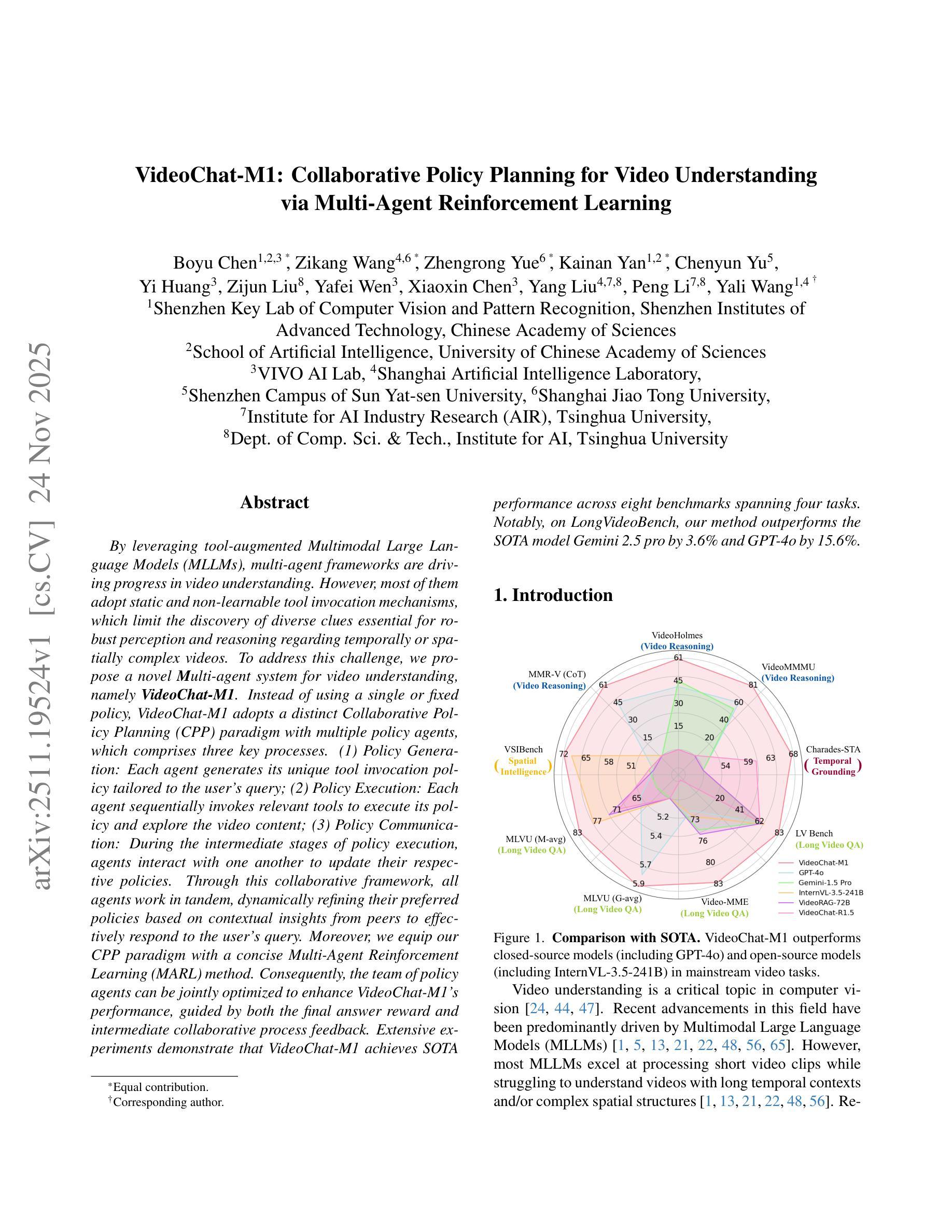 借助工具增强的多模态大语言模型(MLLMs),多智能体框架正在推动视频理解的进展。然而,大多数框架采用静态和非可学习的工具调用机制,这限制了发现对复杂视频进行时间或空间感知和推理所必需的多样线索。为解决此挑战,我们提出了一种用于视频理解的新型多智能体系统,即VideoChat-M1。VideoChat-M1采用独特的协同策略规划(CPP)范式,配备多个策略智能体,包含三个关键过程:策略生成、策略执行和策略通信。各智能体根据用户查询生成独特的工具调用策略,按顺序调用相关工具执行策略并探索视频内容,并在执行策略的中间阶段相互交互以更新各自策略。通过此协同框架,所有智能体协同工作,根据来自同龄人的上下文洞察动态优化其首选策略,以有效响应用户查询。此外,我们为CPP范式配备了简洁的多智能体强化学习(MARL)方法,可联合优化策略智能体团队,以提高VideoChat-M1的性能,既受最终答案奖励的指导,也受中间协同过程反馈的影响。广泛实验表明,VideoChat-M1在四项任务的八个基准测试中实现了卓越性能。特别是在LongVideoBench上,我们的方法较SOTA模型Gemini高出2.5%,较GPT-4高出15.6%。