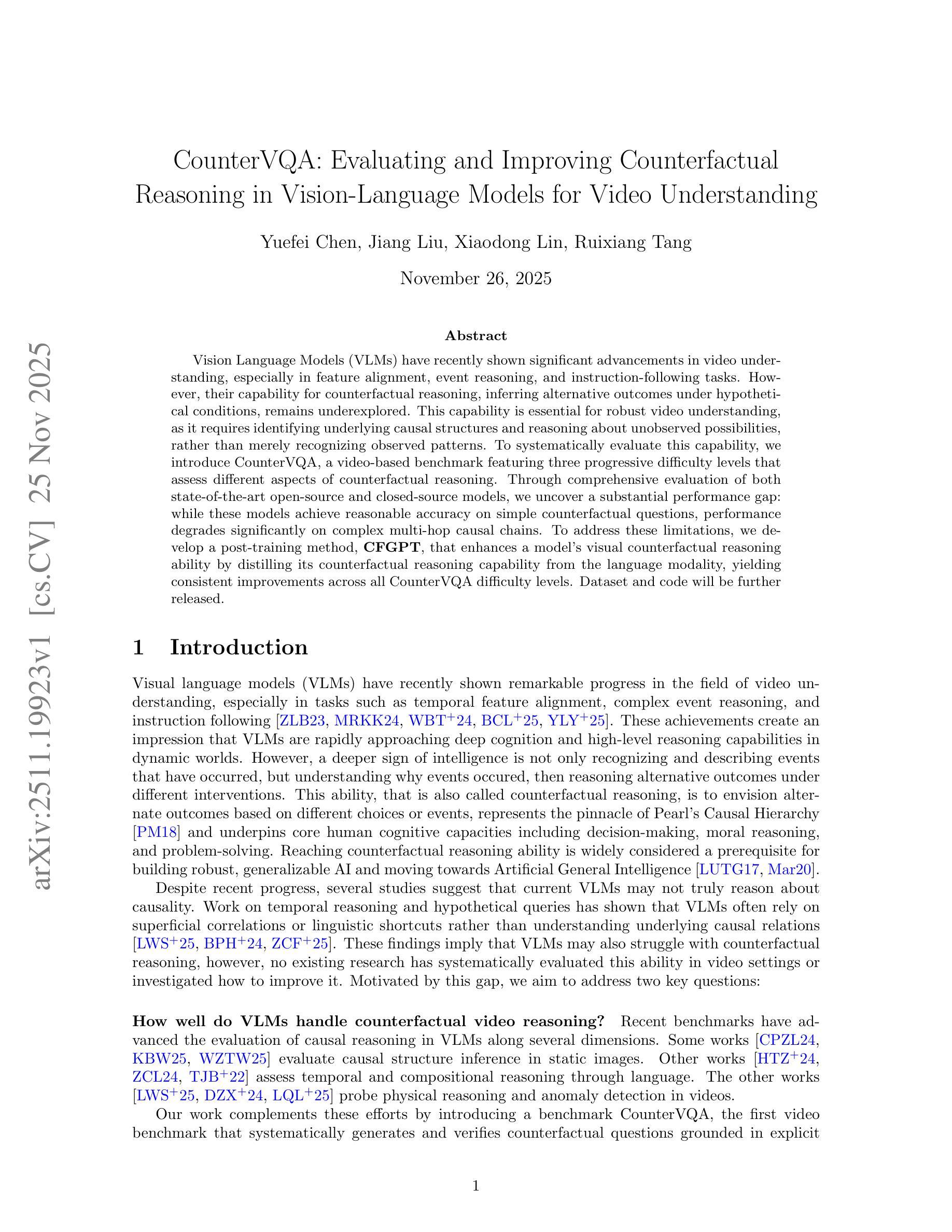 Vision Language Models (VLMs) have recently shown significant advancements in video understanding, especially in feature alignment, event reasoning, and instruction-following tasks. However, their capability for counterfactual reasoning, inferring alternative outcomes under hypothetical conditions, remains underexplored. This capability is essential for robust video understanding, as it requires identifying underlying causal structures and reasoning about unobserved possibilities, rather than merely recognizing observed patterns. To systematically evaluate this capability, we introduce CounterVQA, a video-based benchmark featuring three progressive difficulty levels that assess different aspects of counterfactual reasoning. Through comprehensive evaluation of both state-of-the-art open-source and closed-source models, we uncover a substantial performance gap: while these models achieve reasonable accuracy on simple counterfactual questions, performance degrades significantly on complex multi-hop causal chains. To address these limitations, we develop a post-training method, CFGPT, that enhances a model’s visual counterfactual reasoning ability by distilling its counterfactual reasoning capability from the language modality, yielding consistent improvements across all CounterVQA difficulty levels. Dataset and code will be further released.