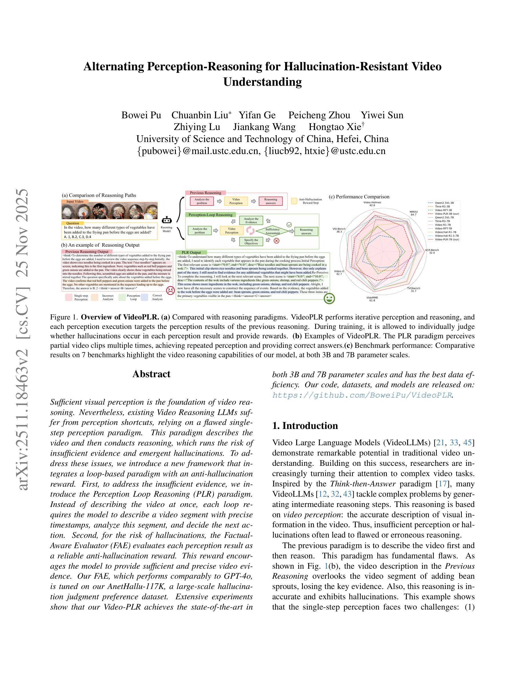 视频感知是视频推理的基础。现有视频推理大型语言模型存在感知捷径问题,依赖于有缺陷的单步感知范式。这种范式描述视频然后进行推理,存在证据不足和出现幻觉的风险。为解决这些问题,我们引入了一个新框架,结合循环感知范式和抗幻觉奖励。首先,为解决证据不足的问题,我们提出感知循环推理(PLR)范式。该范式不要求一次性描述整个视频,而是要求模型按精确时间戳描述视频片段、分析片段并决定下一步行动。其次,为解决幻觉风险,我们采用事实感知评估器(FAE)评估每次感知结果,作为可靠的抗幻觉奖励。奖励鼓励模型提供充足且精确的视频证据。我们的FAE在大型幻觉判断偏好数据集AnetHallu-117K上进行了微调,性能可与GPT-4o相媲美。实验表明,我们的视频PLR在3B和7B参数规模上均达到最新水平,并且数据效率最高。