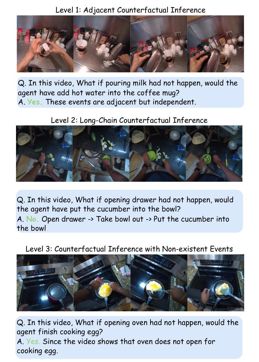 - 反事实推理能力对于鲁棒的视频理解至关重要,要求模型能够识别潜在的因果结构和推理未观察到的可能性。