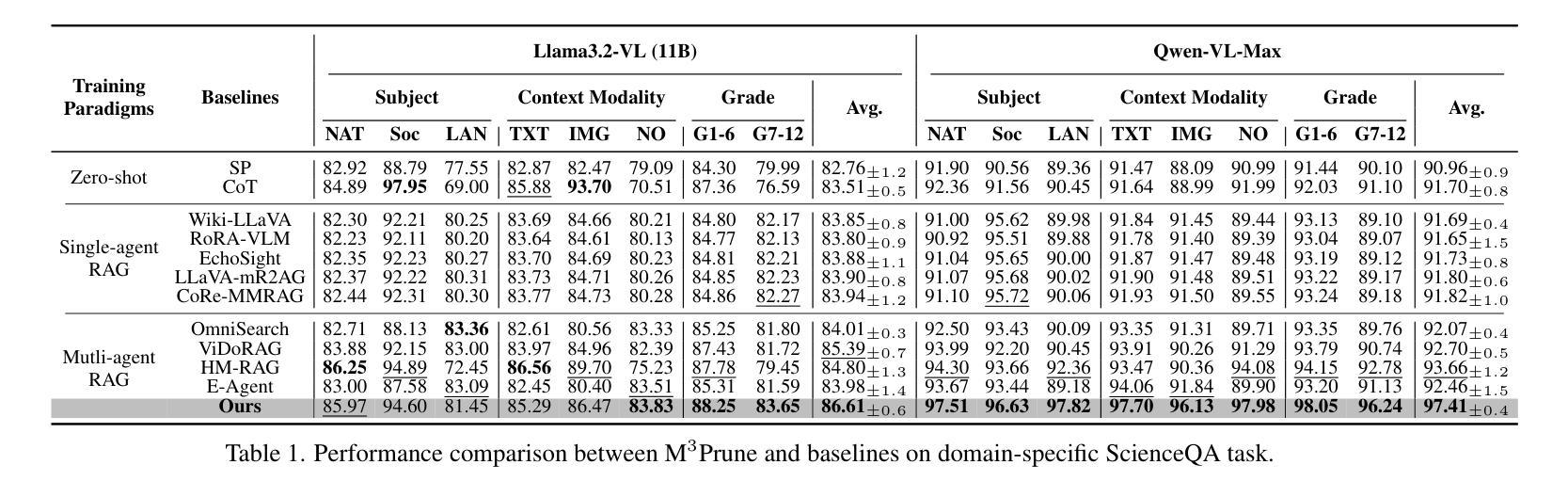 - 在多种基准测试中,M^3Prune表现出优异的性能,优于单智能体和健壮的多智能体mRAG系统。