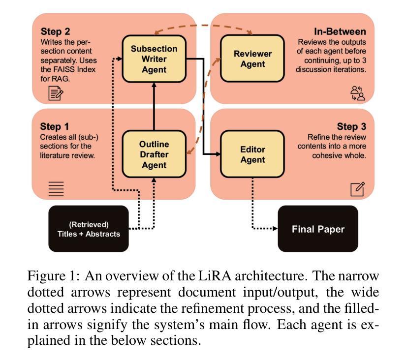 - LiRA是一种多智能体协作工作流程,模拟人类文献综述过程,包括内容概述、小节写作、编辑和审稿等环节。