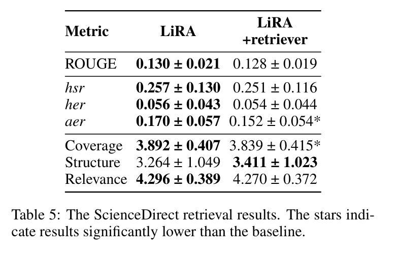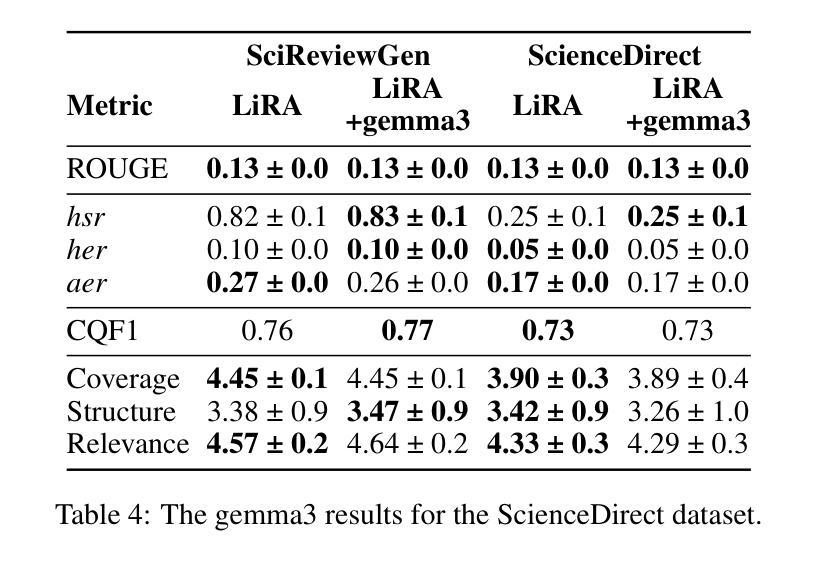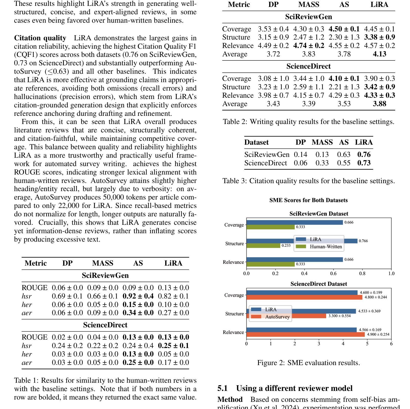 - LiRA在保持与人工撰写综述相似的同时展现了较高的性能。