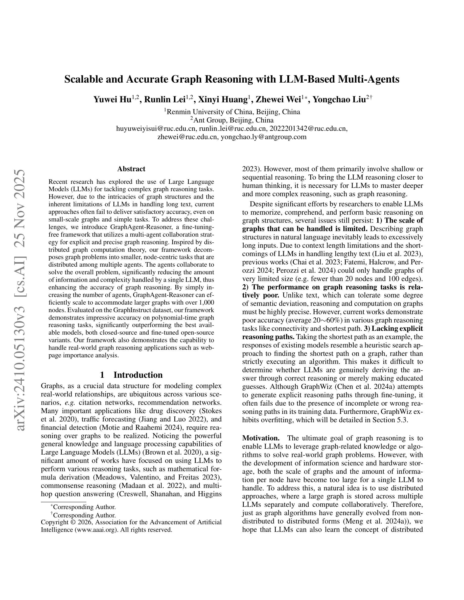 大型语言模型在处理复杂图推理任务时存在挑战。为此,提出GraphAgent-Reasoner框架,采用多智能体协同策略进行显式精确图推理。该框架将图问题分解为多个节点为中心的任务,分配给多个智能体解决,从而提高图推理的准确性并有效扩展至大规模图。在GraphInstruct数据集上的评估表明,该框架在多项式时间图推理任务上表现出近乎完美的准确性,显著优于现有模型。
