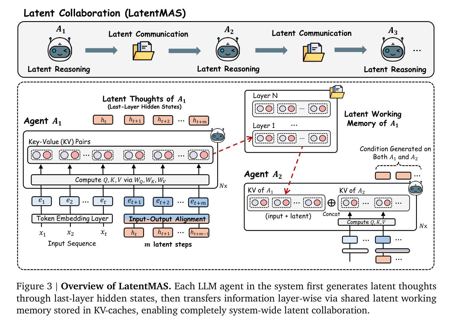 多智能体系统(MAS)将大型语言模型(LLM)从独立的单模型推理扩展到协同系统级智能。虽然现有的LLM代理依赖于文本介导的推理和通信,但我们通过使模型能够在连续的潜在空间内直接协作而迈出了一步。我们介绍了LatentMAS,这是一种端到端无需训练框架,可实现LLM代理之间的纯粹潜在协作。在LatentMAS中,每个代理首先通过最后一层隐藏嵌入执行自动回归潜在思想生成。然后,共享潜在工作内存保留并转移每个代理的内部表示,确保无损的信息交换。我们提供理论分析证明,LatentMAS在实质降低复杂性的同时,实现了更高的表达性和无损信息保留,优于基于文本的传统MAS。此外,涵盖数学和科学推理、常识理解和代码生成等9项综合基准测试的实证评估表明,LatentMAS始终优于强大的单模型和基于文本的MAS基线,准确率提高高达14.6%,输出令牌使用量减少70.8%-83.7%,并提供4倍至4.3倍的端到端推理速度。结果表明,我们新的潜在协作框架在提高系统级推理质量的同时,无需任何额外训练即可实现实质性的效率提升。代码和数据已全部开源在https://github.com/Gen-Verse/LatentMAS。