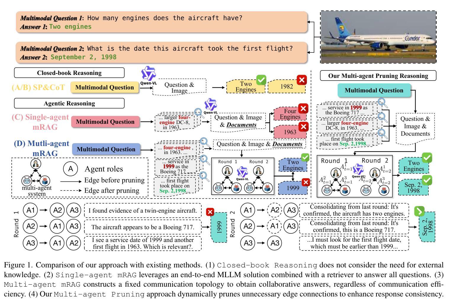 近期多模态检索增强生成(mRAG)的进展,通过外部知识增强多模态大型语言模型(MLLMs),表明通过有效沟通,多智能体的集体智慧可以显著超越单一模型。尽管性能令人印象深刻,但现有的多智能体系统不可避免地会产生大量的令牌开销和增加的计算成本,为大规模部署带来挑战。为了解决这些问题,我们提出了一种新型的多模态多智能体分层通信图剪枝框架,称为M$^3$Prune。我们的框架消除了不同模态之间的冗余边,实现了任务性能和令牌开销之间的最优平衡。具体来说,M$^3$Prune首先应用模态内图简化的方法对文本和视觉模态进行简化,识别出解决任务至关重要的边缘。随后,我们使用这些关键边缘构建动态通信拓扑进行模态间图简化。最后,我们逐步删除冗余边缘,以获得更高效和分层化的拓扑结构。在通用和特定领域的mRAG基准测试上的大量实验表明,我们的方法在性能上始终优于单智能体和健壮的多智能体mRAG系统,同时大大降低了令牌消耗。