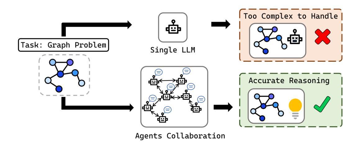 最近的研究探讨了使用大型语言模型(LLM)来解决复杂的图推理任务。然而,由于图结构的复杂性以及LLM在处理长文本时的固有局限性,当前的方法往往难以达到令人满意的准确性,即使在小型图和简单任务上也是如此。为了应对这些挑战,我们引入了GraphAgent-Reasoner,这是一个无需精细调整的框架,它利用多智能体协作策略进行明确和精确的图推理。我们的框架受到分布式图计算理论的启发,将图问题分解为较小的、以节点为中心的任务,这些任务被分配给多个智能体。智能体协作解决总体问题,从而大大减少单个LLM处理的信息量和复杂性,提高了图推理的准确性。通过简单地增加智能体的数量,GraphAgent-Reasoner可以有效地扩展到容纳超过1000个节点的大型图。在GraphInstruct数据集上的评估表明,我们的框架在多项式时间图推理任务上达到了近乎完美的准确性,显著优于现有的最佳模型,包括封闭源代码和经过精细调整的开源变体。我们的框架还展示了处理真实世界图推理应用程序的能力,如网页重要性分析。