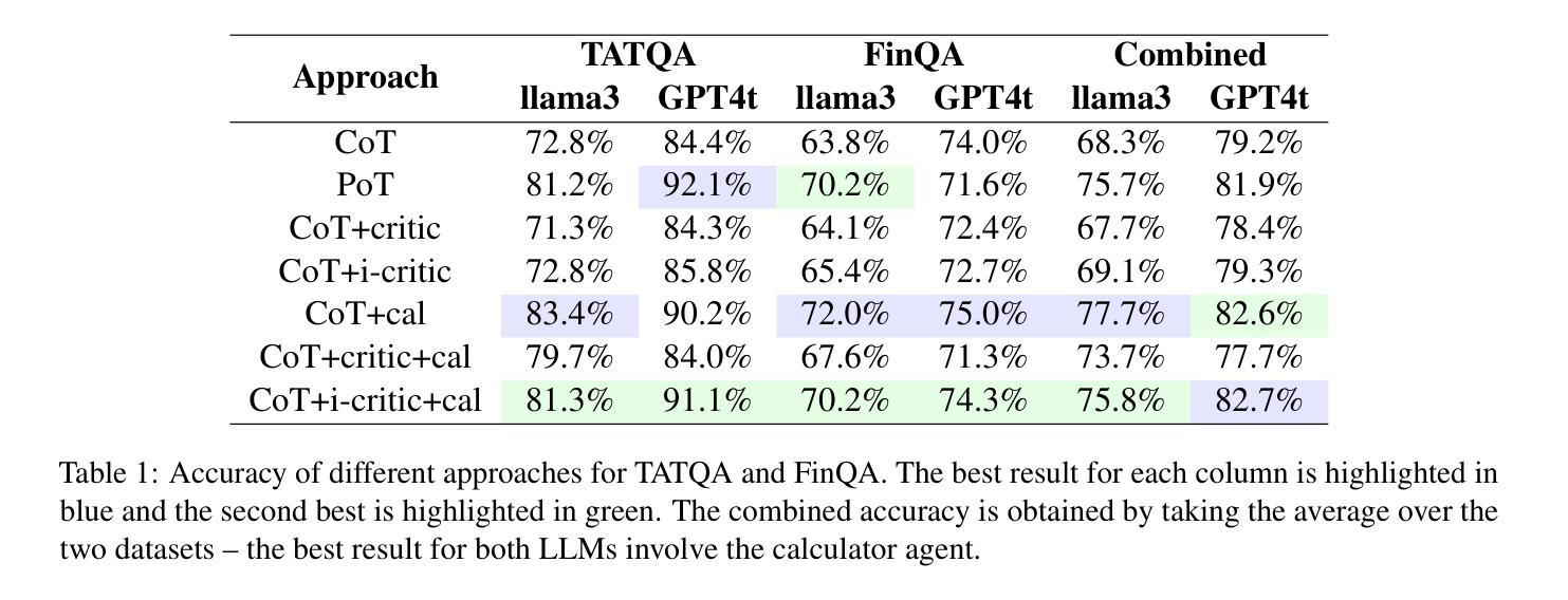 大型语言模型(LLM)在多个自然语言处理任务中表现出了令人印象深刻的能力。然而,LLM在包含表格和文本数据的金融文档的数值问答方面仍然面临挑战。最近有研究表明,给定参考标签的情况下,批判代理(即自我校正)对于此任务非常有效。本文在此框架基础上,探讨了在没有参考标签的情况下传统批判代理的有效性,并通过实验表明,在这种情况下,该批判代理的性能会下降。鉴于此,我们提出了一种改进的批判代理和计算器代理相结合的方法,该方法在性能和安全性方面超过了先前的最新方法(思考程序)。此外,我们还研究了我们的代理之间的相互作用以及这种互动对他们表现的影响。