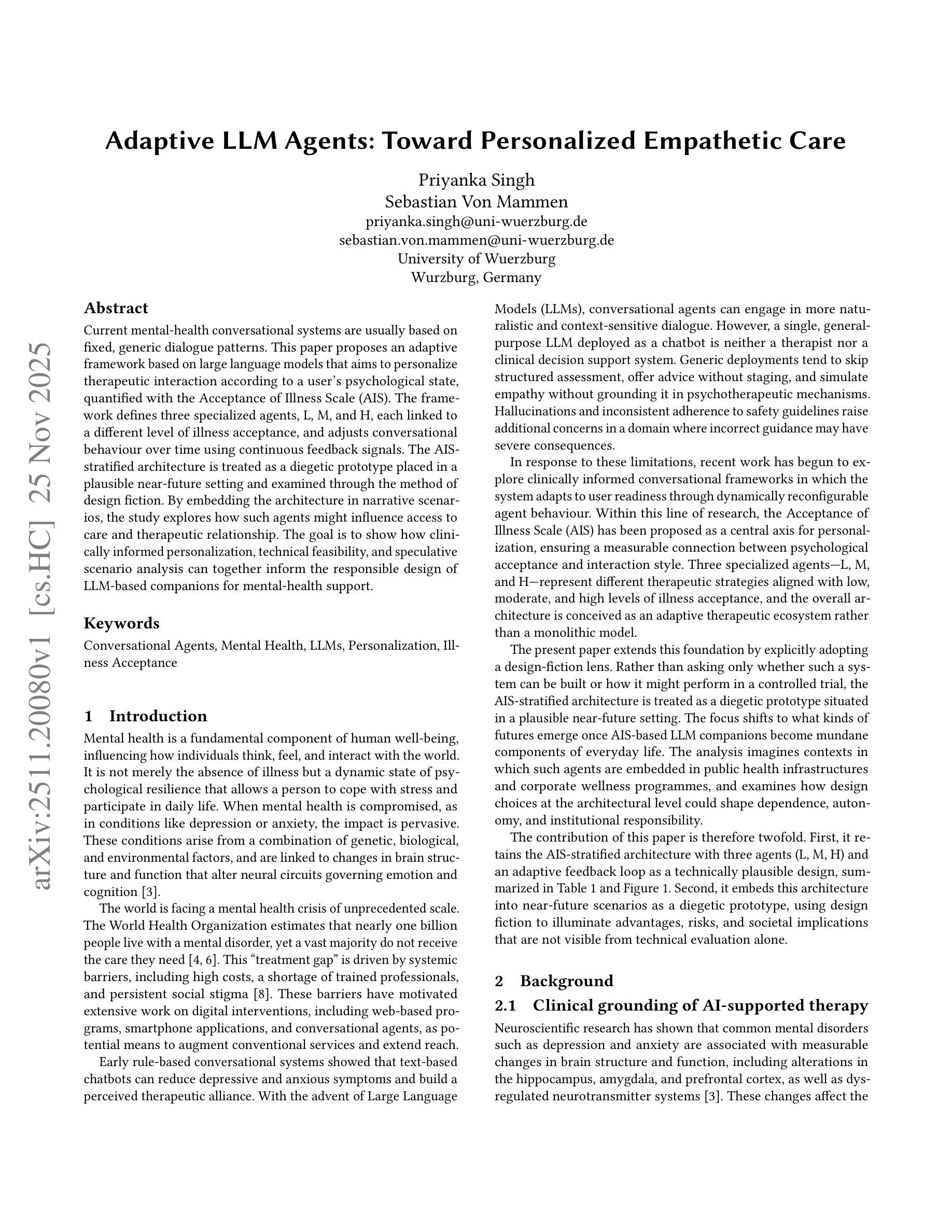 当前的心理健康对话系统通常基于固定、通用的对话模式。本文提出了一个基于大型语言模型的自适应框架,旨在根据用户的心理状态(通过疾病接受度量表(AIS)进行量化)对治疗互动进行个性化设置。该框架定义了三个专业代理L、M和H,它们与不同的疾病接受程度相关联,并利用连续反馈信号随着时间的推移调整对话行为。AIS分层架构被视为一个嵌入在可信的近未来环境中的叙述原型,并通过设计小说的方法进行检查。通过将架构嵌入叙事场景中,该研究探索了这些代理如何影响护理的获取和治疗关系。目标是展示临床个性化、技术可行性和假设情景分析如何共同为基于大型语言模型的心理健康支持伴侣的负责任设计提供信息。