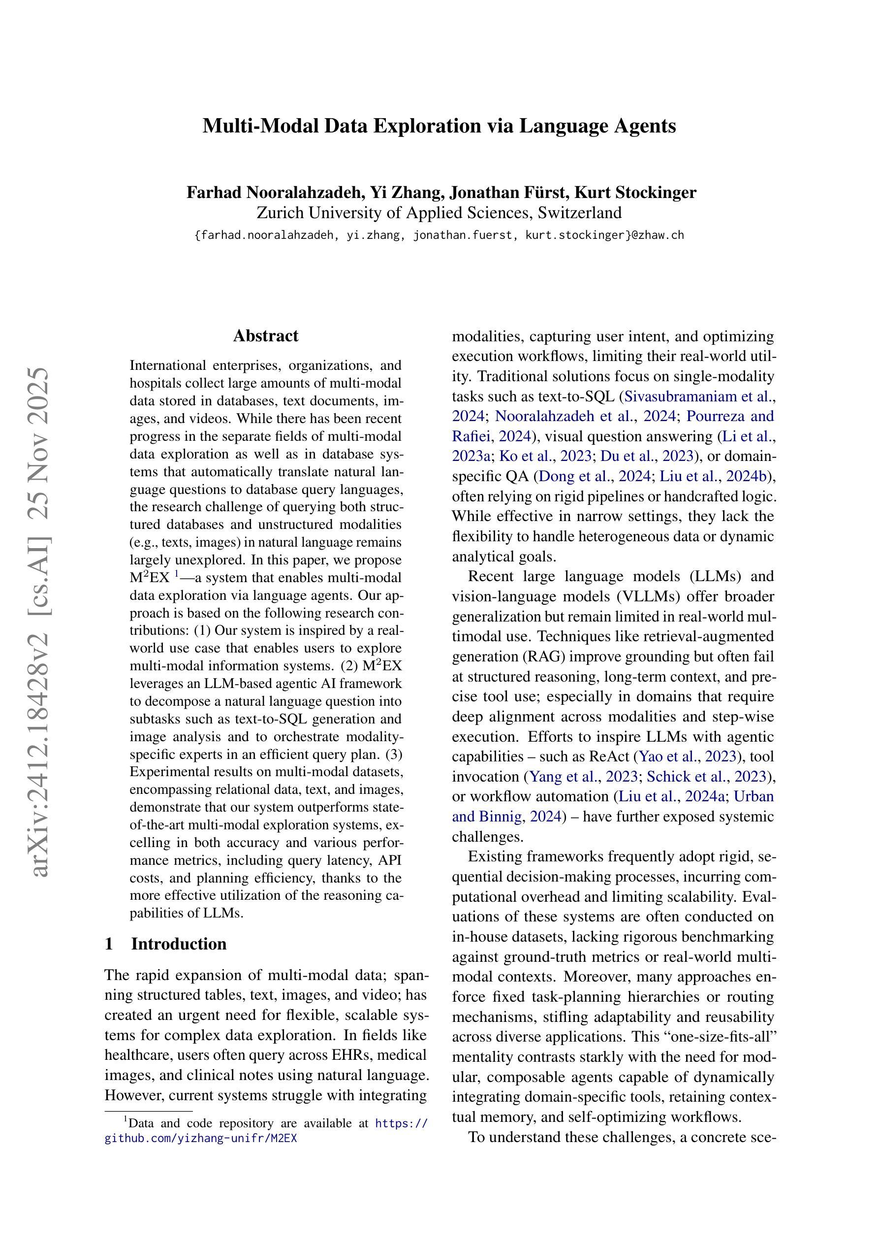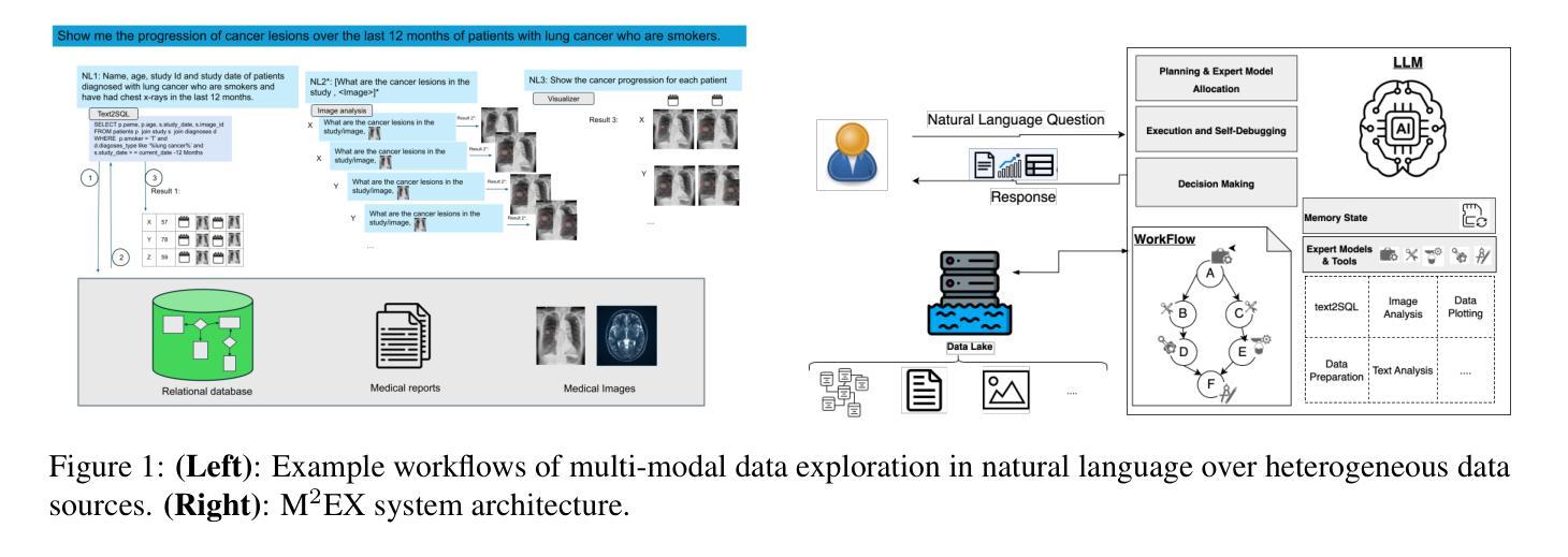 国际企业、组织和医院收集大量多模式数据,存储在数据库、文本文档、图像和视频中。虽然最近在多模式数据探索领域以及自动将自然语言问题翻译成数据库查询语言的数据库系统领域都取得了进展,但使用自然语言查询结构化数据库和非结构化模式(如文本、图像)的研究挑战仍然很大程度上未被探索。在本文中,我们提出了M$^2$EX系统,该系统可通过语言智能体进行多模式数据探索。我们的方法基于以下研究贡献:(1)我们的系统受到实际使用案例的启发,使用户能够探索多模式信息系统。(2)M$^2$EX利用基于大型语言模型(LLM)的智能体AI框架,将自然语言问题分解为文本到SQL生成和图像分析等子任务,并有效地协调模态特定专家制定查询计划。(3)在包含关系数据、文本和图像的多模式数据集上的实验结果表明,我们的系统在先进的多模式探索系统中表现出色,在准确性以及各种性能指标(包括查询延迟、API成本和规划效率)上都更胜一筹,这得益于对LLM推理能力的更有效利用。
