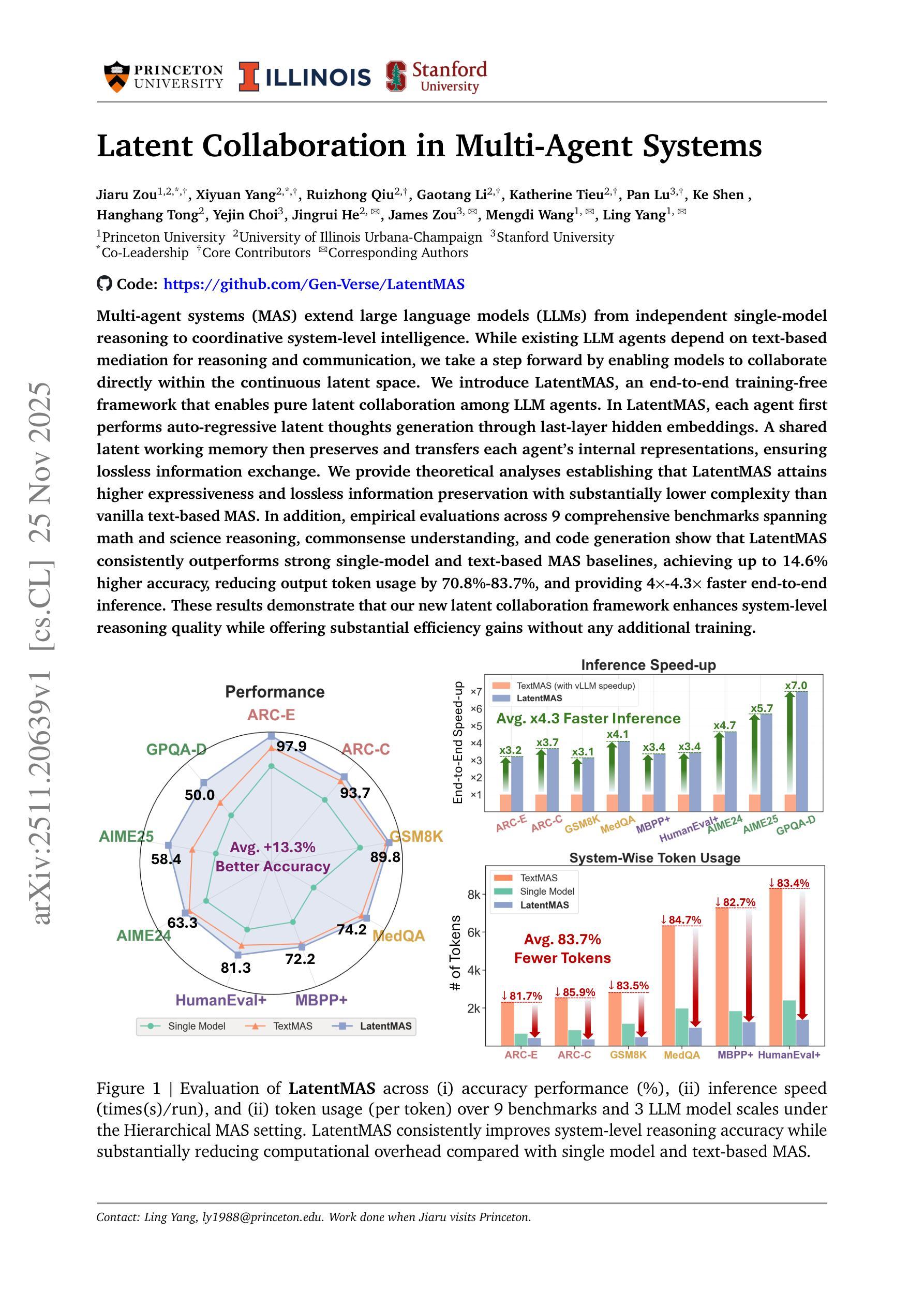 Multi-agent systems (MAS) extend large language models (LLMs) from independent single-model reasoning to coordinative system-level intelligence. While existing LLM agents depend on text-based mediation for reasoning and communication, we take a step forward by enabling models to collaborate directly within the continuous latent space. We introduce LatentMAS, an end-to-end training-free framework that enables pure latent collaboration among LLM agents. In LatentMAS, each agent first performs auto-regressive latent thoughts generation through last-layer hidden embeddings. A shared latent working memory then preserves and transfers each agent’s internal representations, ensuring lossless information exchange. We provide theoretical analyses establishing that LatentMAS attains higher expressiveness and lossless information preservation with substantially lower complexity than vanilla text-based MAS. In addition, empirical evaluations across 9 comprehensive benchmarks spanning math and science reasoning, commonsense understanding, and code generation show that LatentMAS consistently outperforms strong single-model and text-based MAS baselines, achieving up to 14.6% higher accuracy, reducing output token usage by 70.8%-83.7%, and providing 4x-4.3x faster end-to-end inference. These results demonstrate that our new latent collaboration framework enhances system-level reasoning quality while offering substantial efficiency gains without any additional training. Code and data are fully open-sourced at https://github.com/Gen-Verse/LatentMAS.