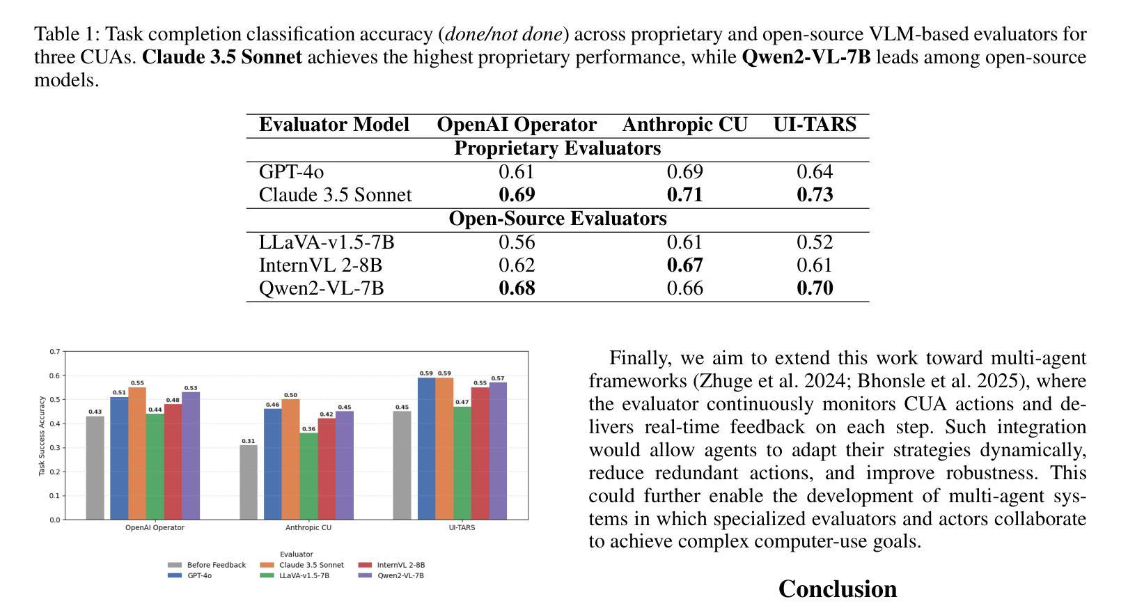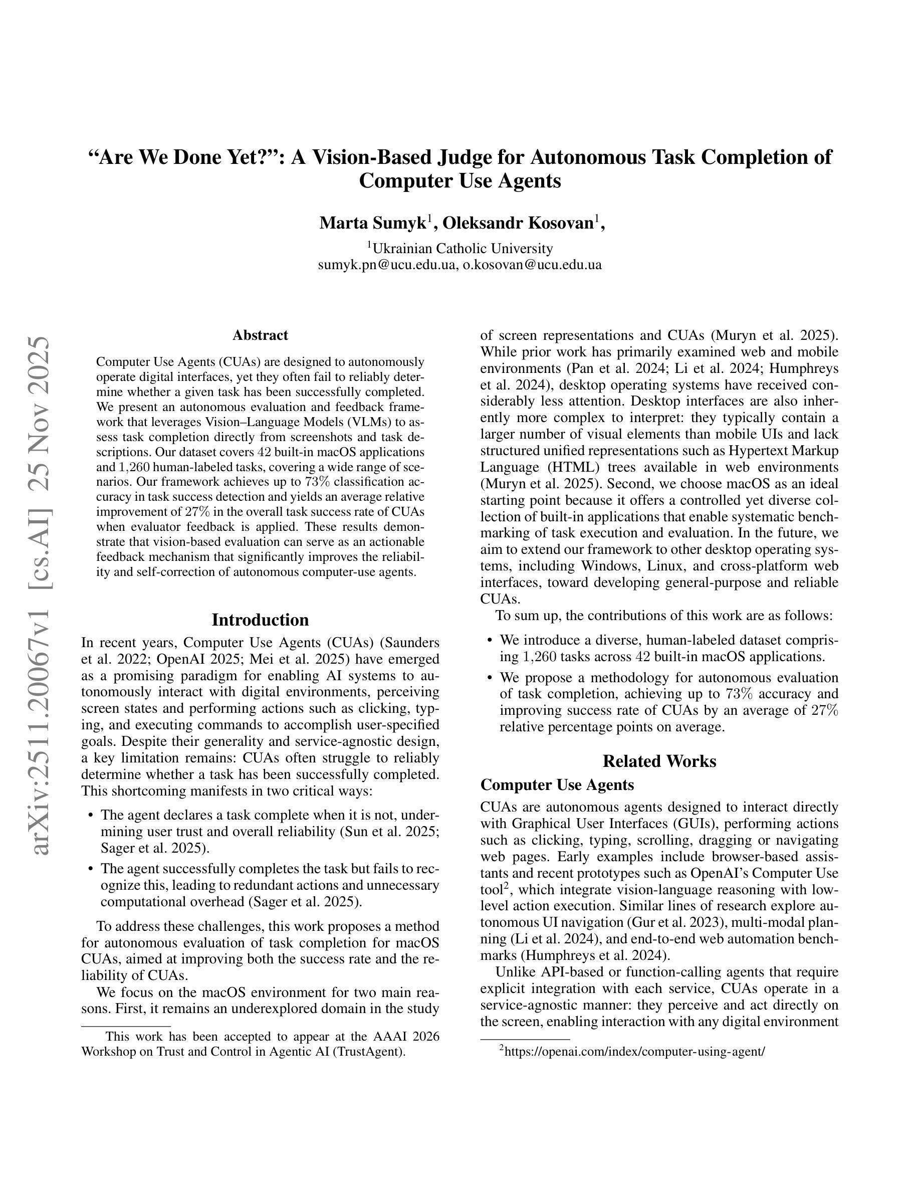 计算机使用代理(CUAs)旨在自主操作数字界面,但往往无法可靠地判断给定任务是否完成。本研究提出了一种自主评估和反馈框架,利用视觉语言模型直接通过屏幕截图和任务描述来评估任务完成情况。该数据集涵盖了42个内置的macOS应用程序和1260个人类标签任务,涉及多种场景。该框架在任务成功检测方面达到了73%的准确率,并在应用评估者反馈后,整体任务成功率平均提高了27%。这些结果表明,基于视觉的评估可以作为有效的反馈机制,提高计算机使用代理的可靠性和自我修正能力。
