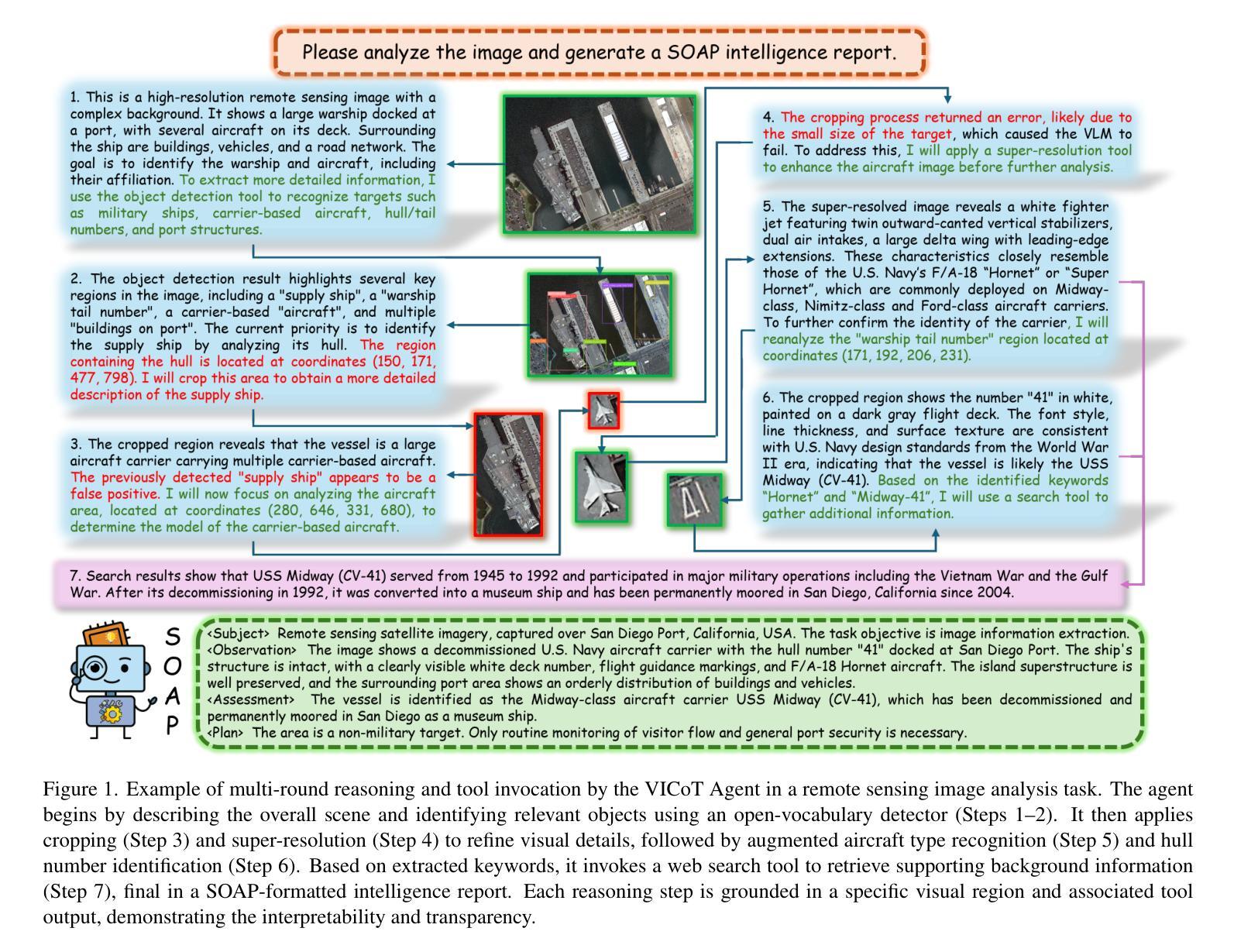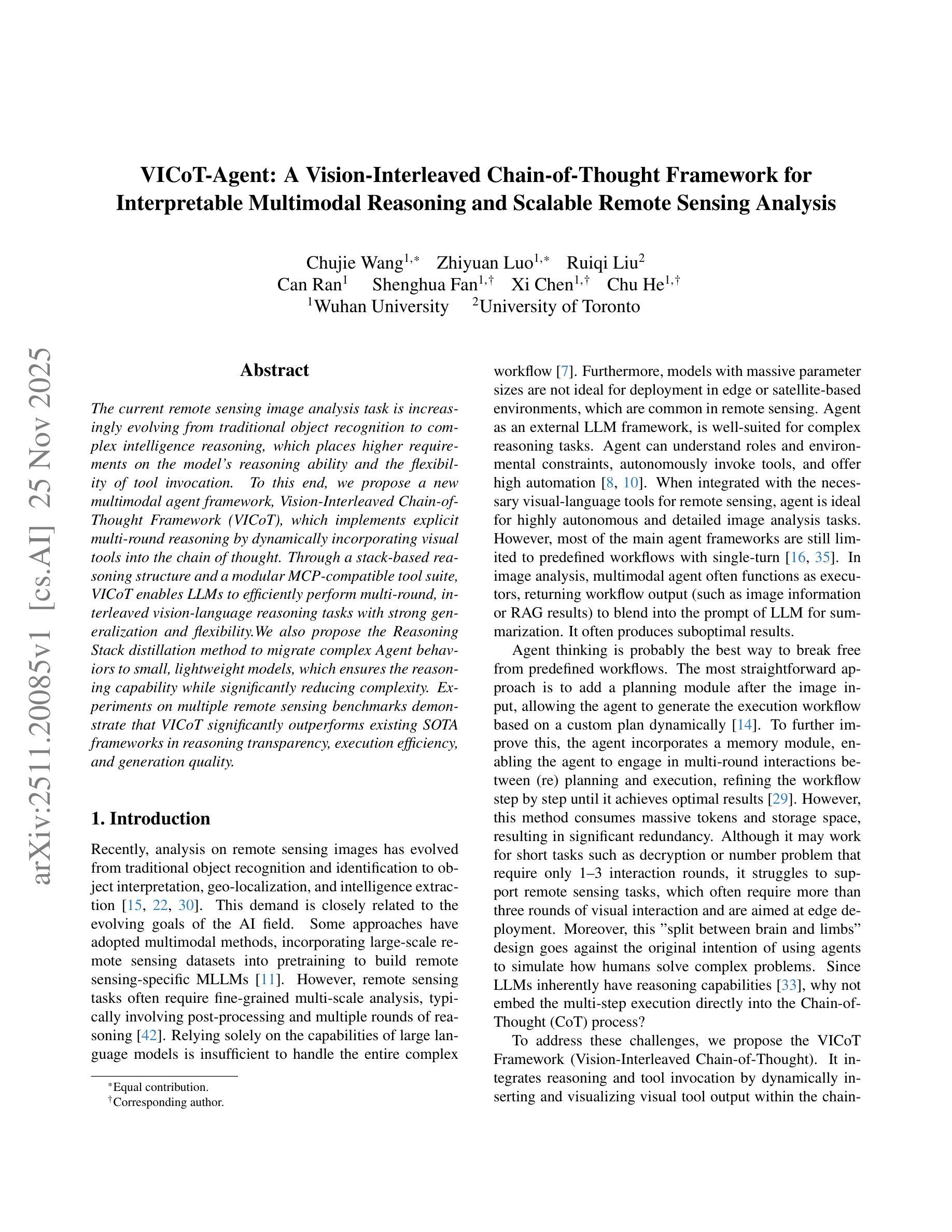 当前遥感图像分析任务正由传统的目标识别向复杂的智能推理转变,这对模型的推理能力和工具调用的灵活性提出了更高的要求。为此,我们提出了一种新的多模态代理框架——Vision-Interleaved Chain-of-Thought Framework(VICoT)。它通过动态将视觉工具融入思维链,实现了显式的多轮推理。通过基于堆栈的推理结构和模块化的MCP兼容工具套件,VICoT使大型语言模型能够高效执行多轮交错式视觉语言推理任务,具有很强的通用性和灵活性。我们还提出了Reasoning Stack蒸馏方法,将复杂的代理行为迁移到小型、轻量级的模型上,这保证了推理能力的同时显著降低了复杂性。在多个遥感基准测试上的实验表明,VICoT在推理透明度、执行效率和生成质量方面显著优于现有的最新框架。