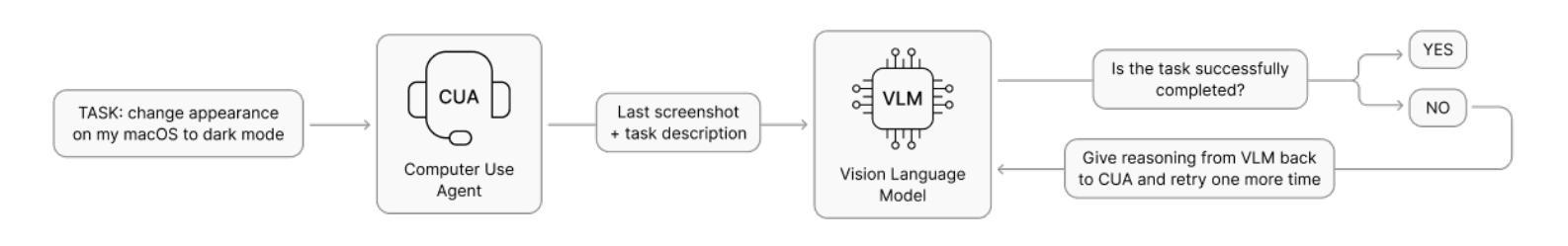 Computer Use Agents (CUAs) are designed to autonomously operate digital interfaces, yet they often fail to reliably determine whether a given task has been completed. We present an autonomous evaluation and feedback framework that uses vision-language models to assess task completion directly from screenshots and task descriptions. Our dataset covers 42 built-in macOS applications and 1,260 human-labeled tasks across a wide range of scenarios. Our framework achieves up to 73 percent accuracy in task success detection and yields an average relative improvement of 27 percent in overall task success when evaluator feedback is applied. These results show that vision-based evaluation can serve as an effective feedback mechanism that improves the reliability and self-correction of autonomous computer-use agents.
