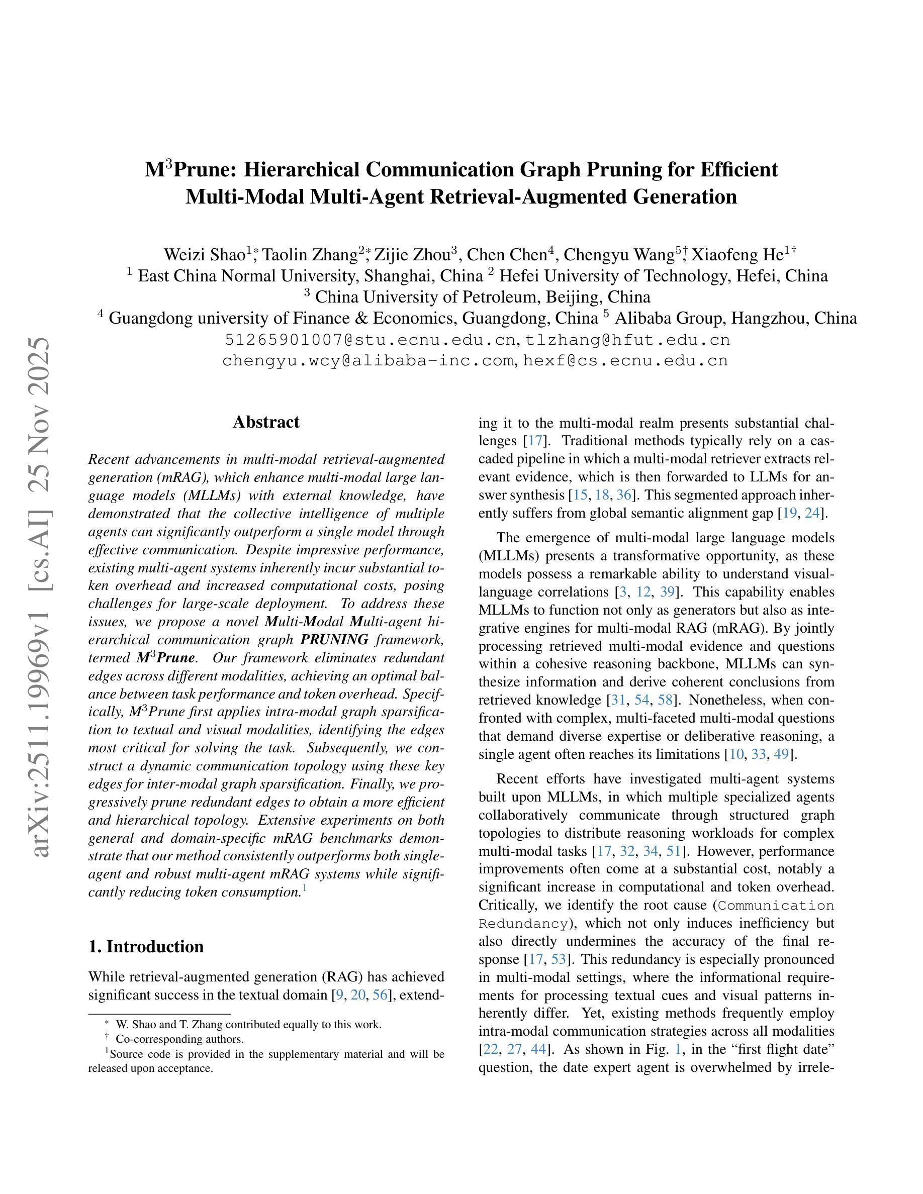 近期多模态检索增强生成(mRAG)技术的进展,通过外部知识增强多模态大型语言模型(MLLMs),并展示了多智能体集体智能通过有效沟通可以显著超越单一模型。为应对现有多智能体系统固有的大量令牌开销和计算成本挑战,我们提出了名为M^3Prune的多模态多智能体分层通信图修剪框架。该框架消除了不同模态之间的冗余边,实现了任务性能和令牌开销之间的最佳平衡。首先,M^3Prune对文本和视觉模态进行内部模态图稀疏化,识别解决任务的最关键边。然后,使用这些关键边构建动态通信拓扑,进行跨模态图稀疏化。最后,逐步修剪冗余边以获得更高效、分层的拓扑结构。在通用和特定领域的mRAG基准测试上,该方法均表现出对单智能体和健壮的多智能体mRAG系统的优越性,同时大大降低了令牌消耗。