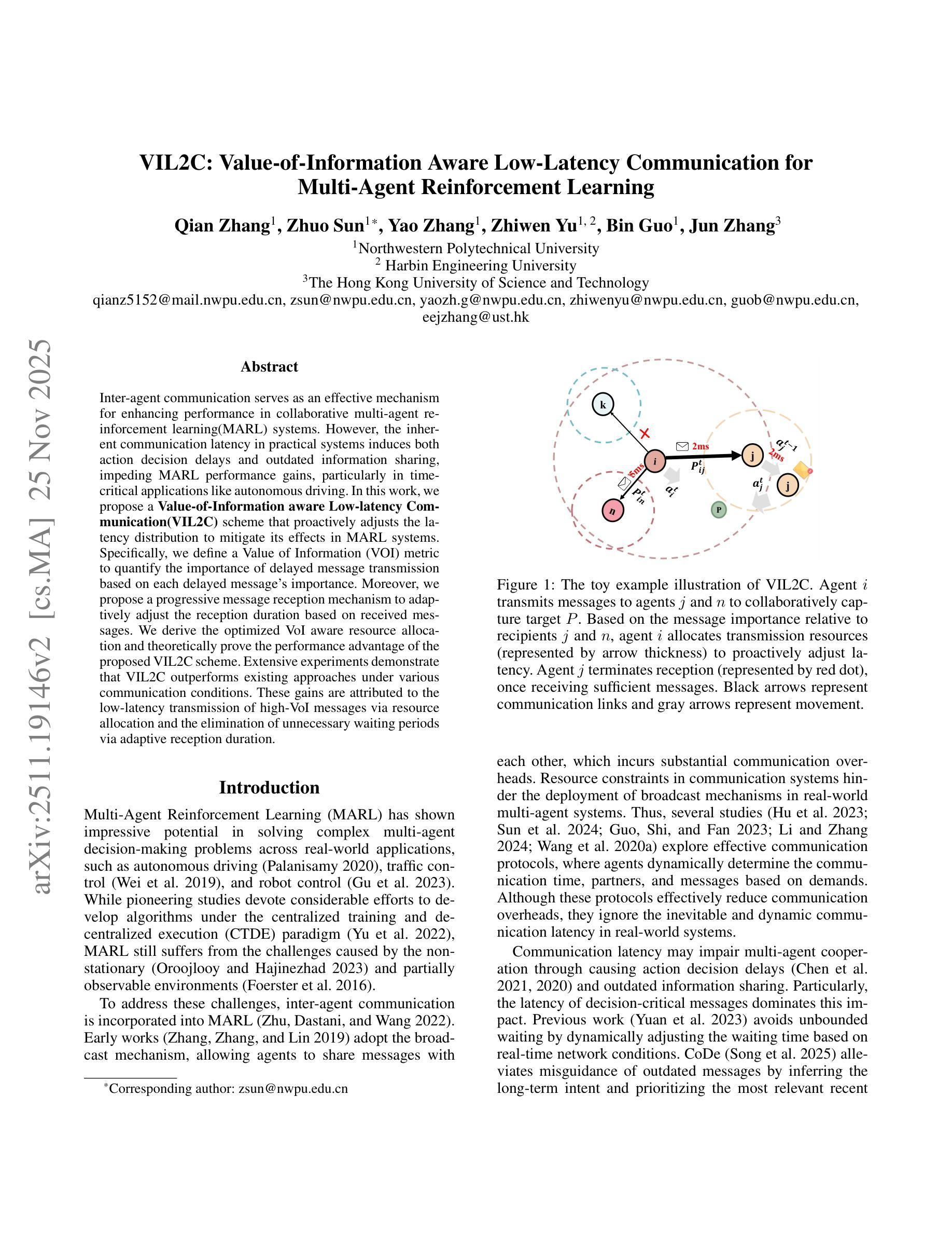 Inter-agent communication serves as an effective mechanism for enhancing performance in collaborative multi-agent reinforcement learning(MARL) systems. However, the inherent communication latency in practical systems induces both action decision delays and outdated information sharing, impeding MARL performance gains, particularly in time-critical applications like autonomous driving. In this work, we propose a Value-of-Information aware Low-latency Communication(VIL2C) scheme that proactively adjusts the latency distribution to mitigate its effects in MARL systems. Specifically, we define a Value of Information (VOI) metric to quantify the importance of delayed message transmission based on each delayed message’s importance. Moreover, we propose a progressive message reception mechanism to adaptively adjust the reception duration based on received messages. We derive the optimized VoI aware resource allocation and theoretically prove the performance advantage of the proposed VIL2C scheme. Extensive experiments demonstrate that VIL2C outperforms existing approaches under various communication conditions. These gains are attributed to the low-latency transmission of high-VoI messages via resource allocation and the elimination of unnecessary waiting periods via adaptive reception duration.