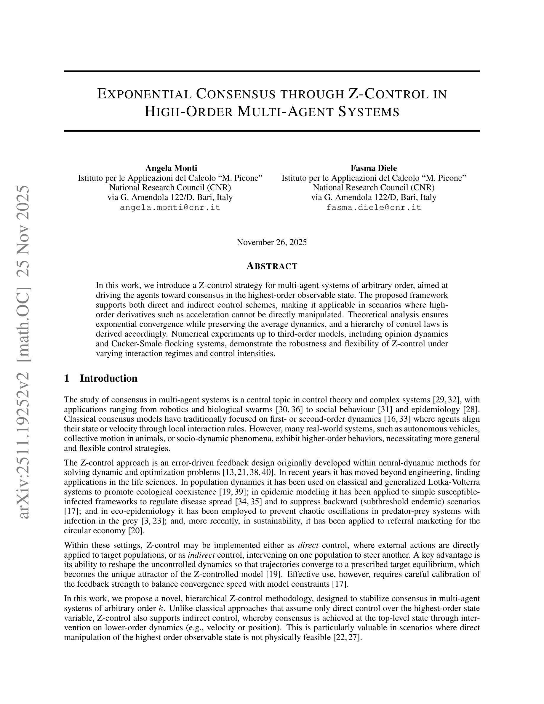 该工作引入了一种用于任意阶多智能体系统的Z控制策略,旨在驱动智能体在最高阶可观测状态下达成一致性。所提框架支持直接和间接控制方案,在高阶导数如加速度无法直接操纵的场景中具有适用性。理论分析确保了指数收敛性并保持了平均动力学,并据此推导了控制律的层次结构。数值实验表明,Z控制在高达三阶模型下具有稳健性和灵活性,适用于意见动态和Cucker-Smale群集系统。