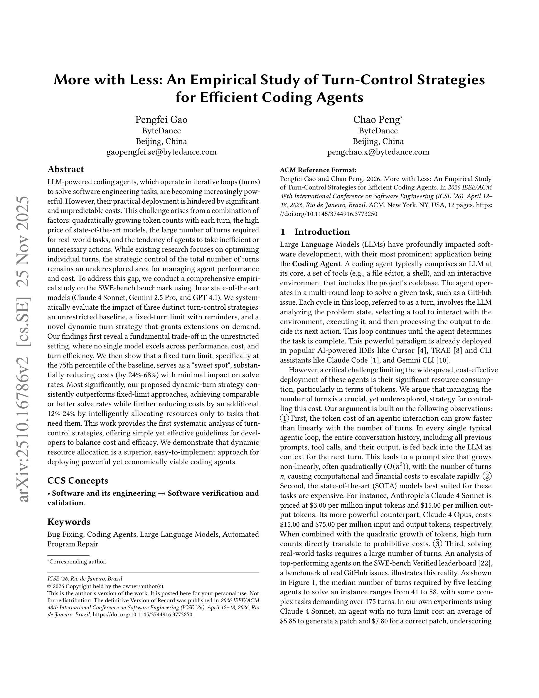 大型语言模型驱动的编码代理,通过在迭代循环(回合)中操作来解决软件工程任务,正变得越来越强大。然而,它们的实际部署受到了显著且不可预测成本的阻碍。这一挑战源于多种因素:随着每个回合的令牌数量呈二次方增长、模型价格高昂、完成现实世界任务所需回合数众多,以及代理倾向于采取低效或不必要的行动。尽管现有研究侧重于优化单个回合,但对回合总数的战略控制仍是管理代理性能和成本的未被充分探索的领域。为了弥补这一空白,我们在SWE-bench上进行了全面的实证研究,使用了三种最先进的模型,并评估了三种不同的回合控制策略的影响:无限制的基准测试、带有提醒的固定回合限制,以及一种新型按需扩展的动态回合策略。我们的研究结果首先揭示了无限制设置中的基本权衡,在这个设置中,没有单一模型能在性能、成本和回合效率方面表现出色。我们还发现,在基准测试的75th百分位处设定固定回合限制可以作为一个“最佳点”,能够在不影响解决率的情况下大幅降低成本(24%-68%)。最重要的是,动态回合策略始终优于固定限制方法,在实现相当或更好的解决率的同时,通过智能分配资源进一步降低额外成本12%-24%,仅将资源分配给需要的任务。这项工作首次对回合控制策略进行了系统分析,为开发者提供了平衡成本与效果的简单而有效的指导。我们证明动态资源分配是一种优越且易于实施的方法,用于部署强大且经济可行的编码代理。