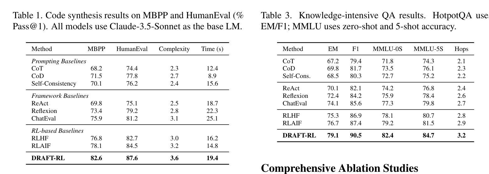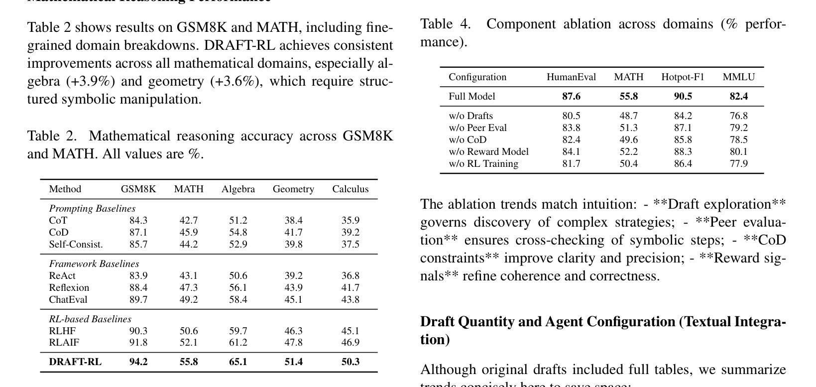 - DRAFT-RL框架集成了草稿链(CoD)推理和强化学习,促进多路径探索和同行间的反思。