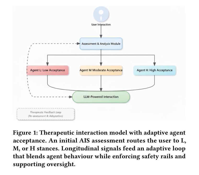 一个基于大型语言模型的自适应框架被提出,用于根据用户的心理状态(通过疾病接受度量表量化)对治疗性互动进行个性化调整。该框架定义了三个专门代理L、M和H,分别与不同程度的疾病接受相关,并随着时间的推移利用持续反馈信号调整对话行为。该研究采用设计虚构的方法将这一架构嵌入叙事场景中,探索此类代理如何影响护理的获取和治疗关系。目标是展示临床个性化的信息、技术可行性和假设情景分析如何共同为基于大型语言模型的心理健康支持伴侣的设计提供指导。